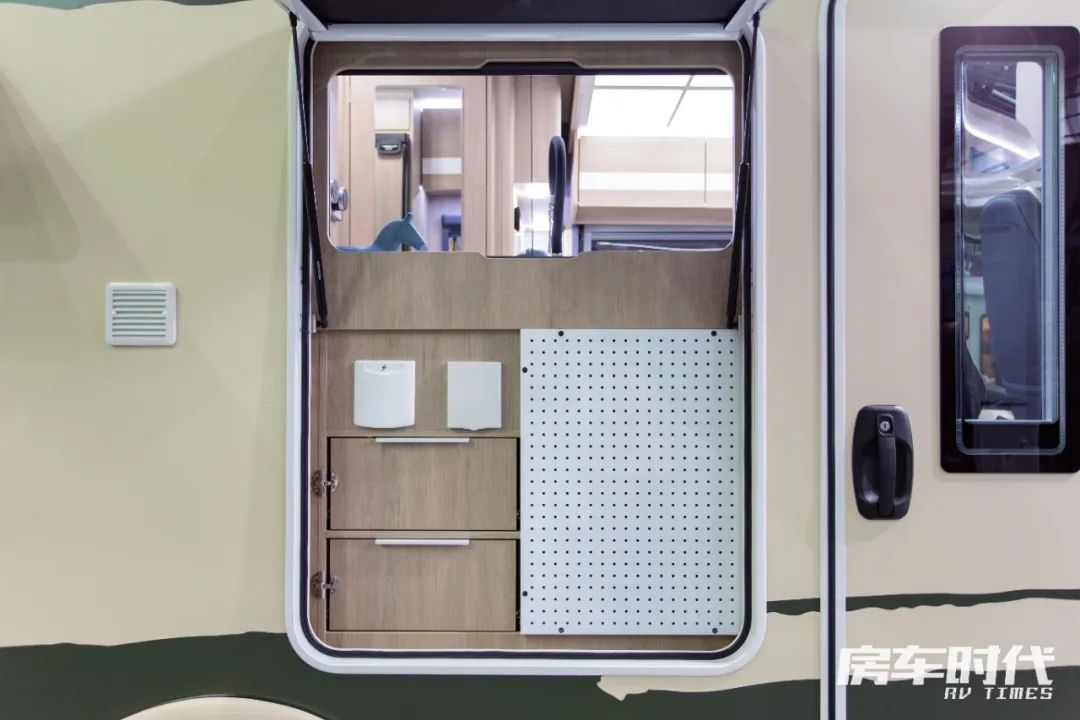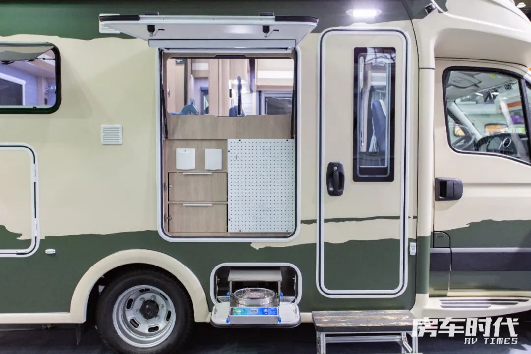 车辆外侧配置有户外淋浴装置、定制遮阳棚(3.5m)、多功能抽拉式灶台、户外插座(220V)、电动伸缩踏步、三眼拖车杠、手动支腿等,其中侧面的储物空间内部做了分隔设计,用户可以更有条理地收纳物品。外侧配置方面,赛德为车友提供了经典美式门、斯比德曼电动遮阳棚、多功能柴油灶等选配项目,用户可以根据需求进行装配。