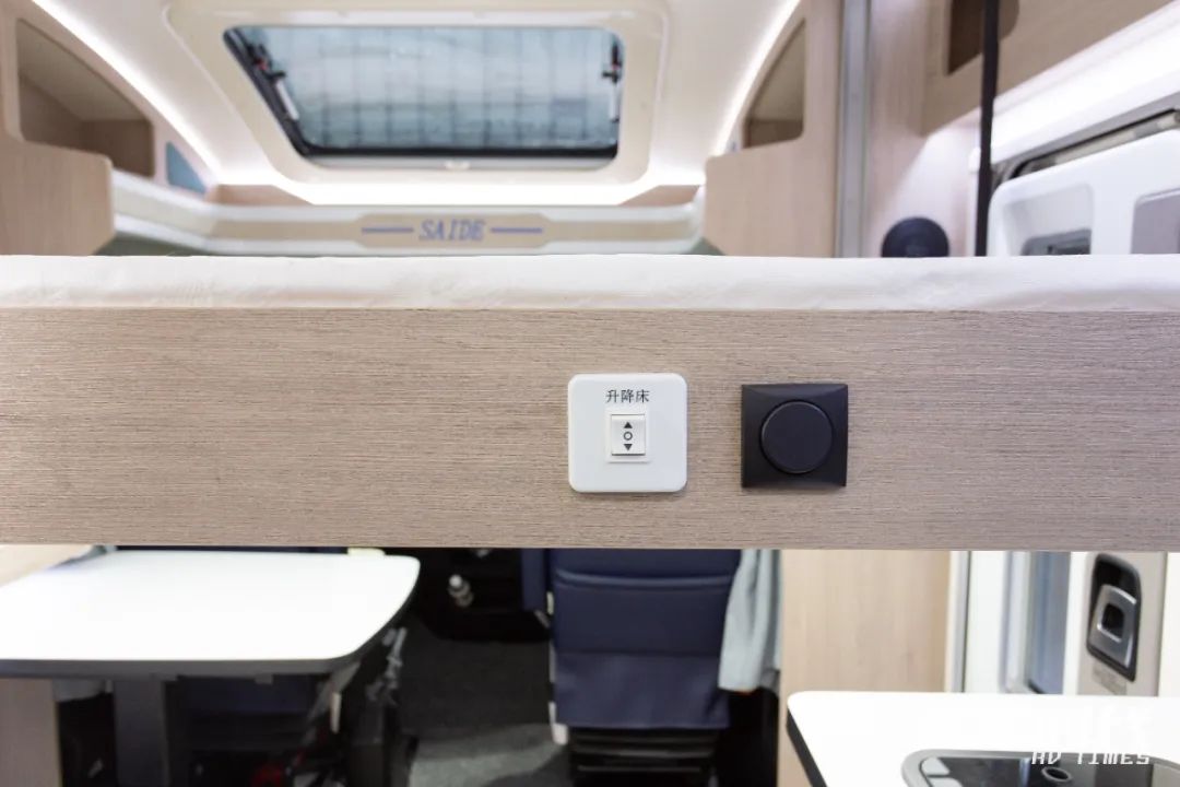 车内灯光系统丰富,会客区上方做了吊柜设计,区域内辅之以隐形灯带进行修饰,简约实用,尽显高级,同时兼顾着简单的置物需求,功能与颜值兼备。会客区顶部配置有一张电动吊床,侧面为升降按钮,操作简单,实用性强。