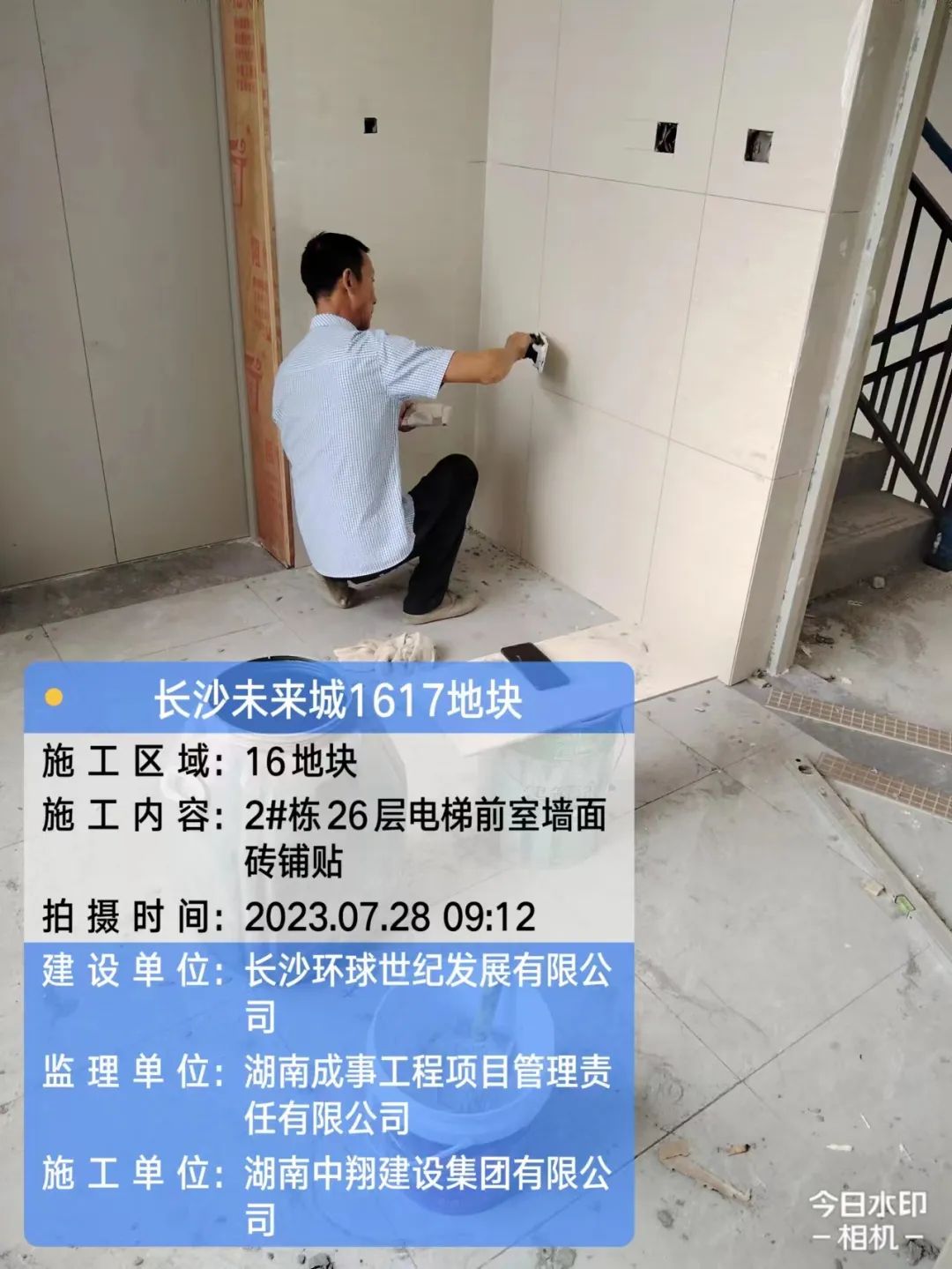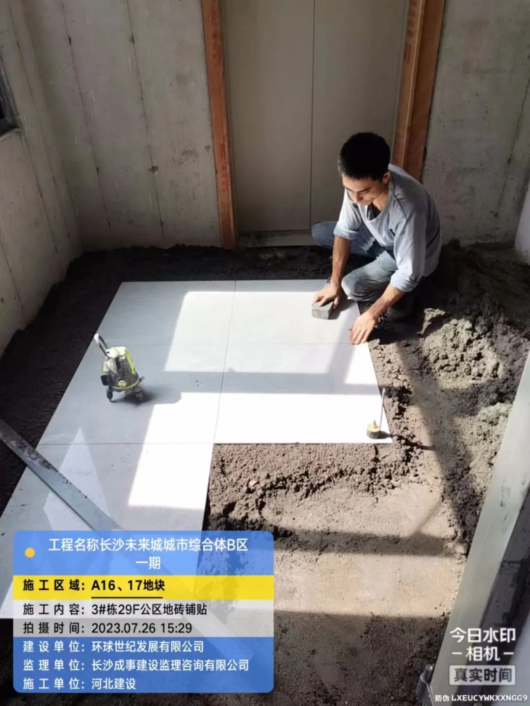 12-16栋电梯门套施工中,13#栋地砖铺贴中。