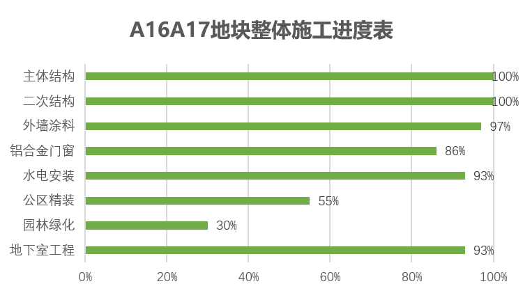 主体结构完成100%;二次结构完成100%;外墙涂料完成97%;铝合金门窗完成86%;水电安装完成93%;公区精装完成55%;地下室机电程完成93%,电梯安装完成100%,园林绿化完成30%。