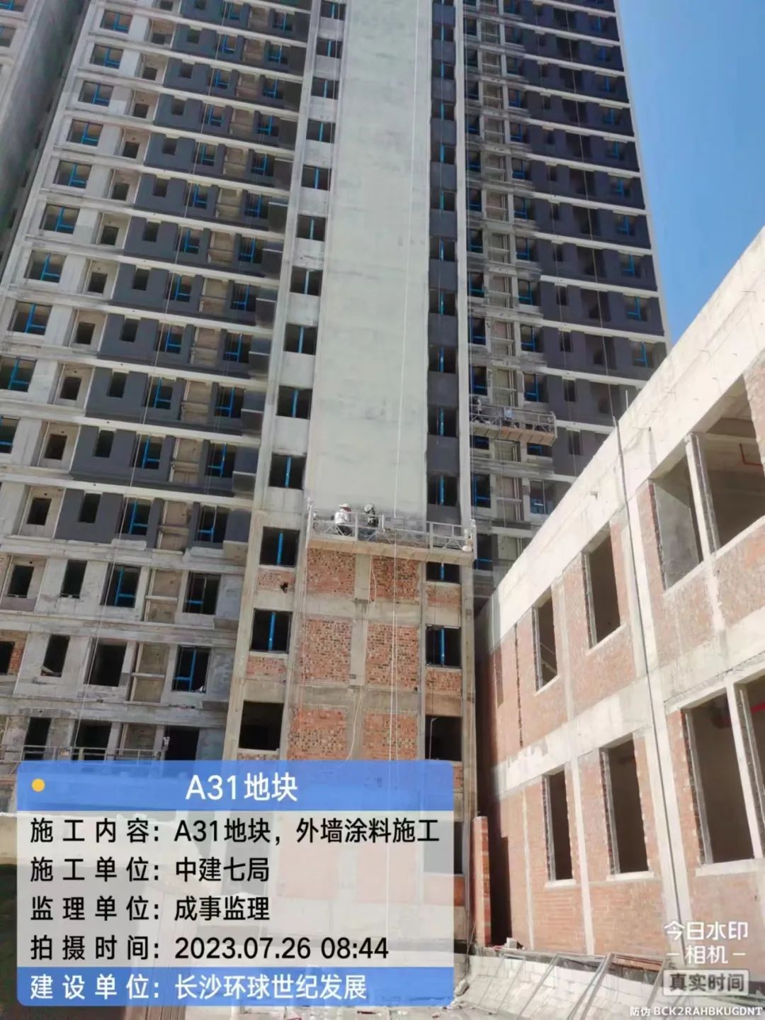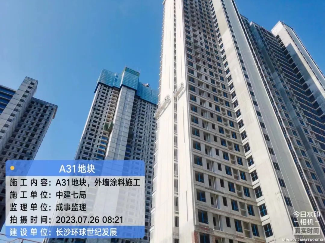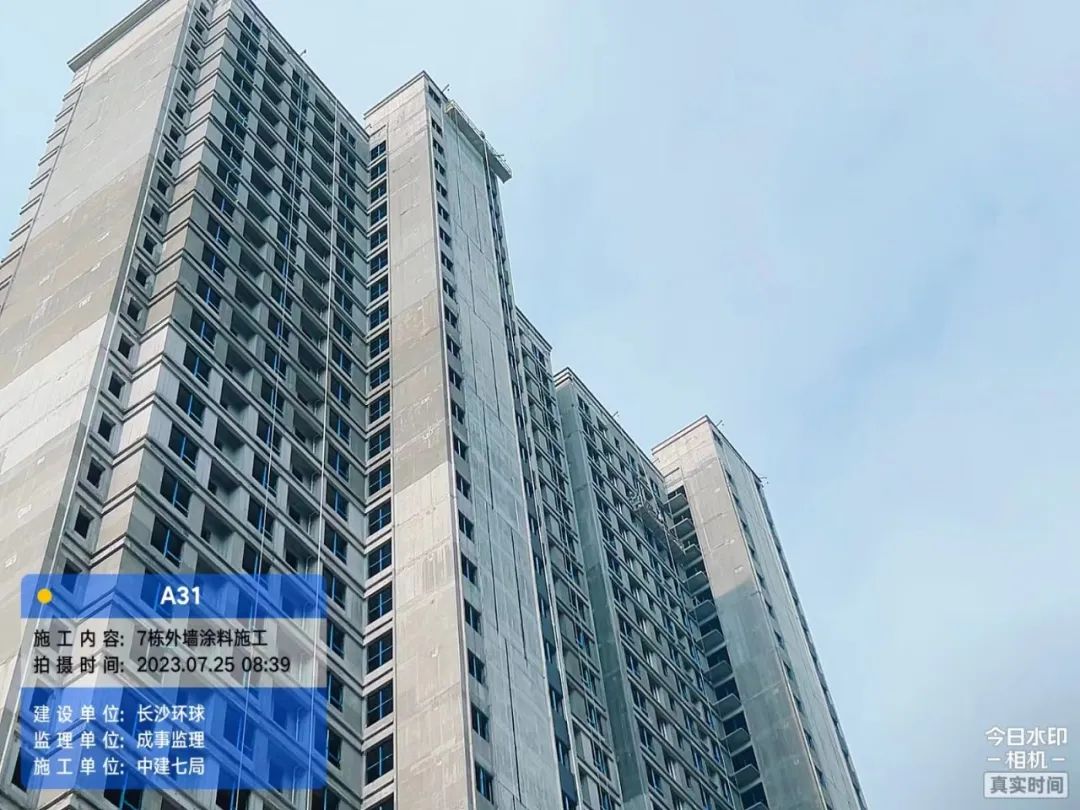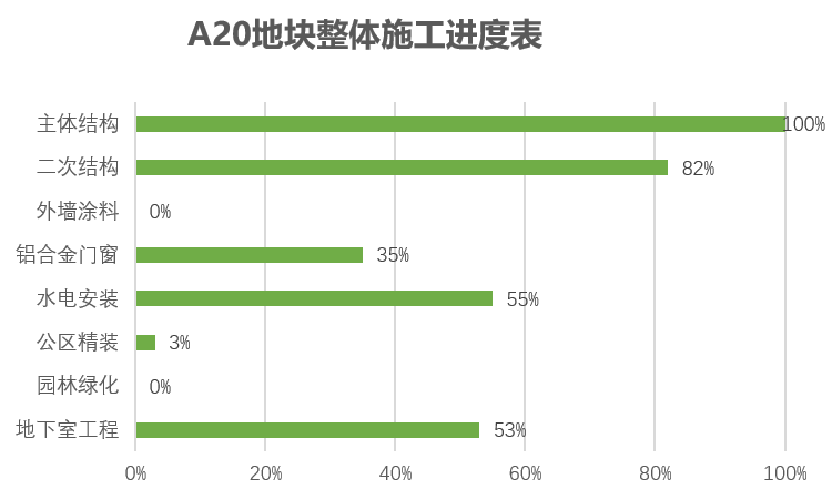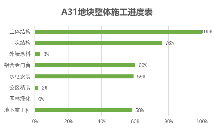 主体结构完成100%;二次结构完成76%;外墙涂料完成3%,铝合金门窗整体完成60%;水电安装完成59%;公区精装完成2%,地下室工程完成58%。
