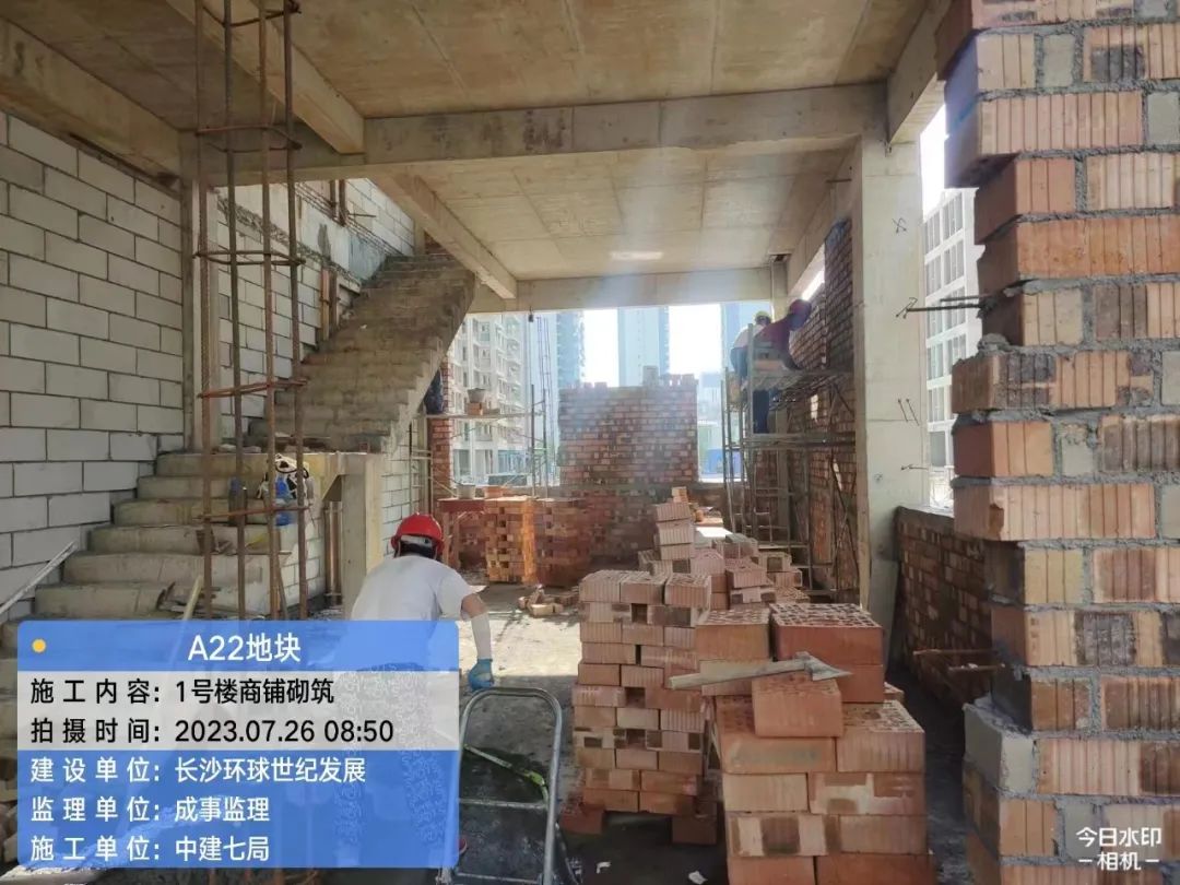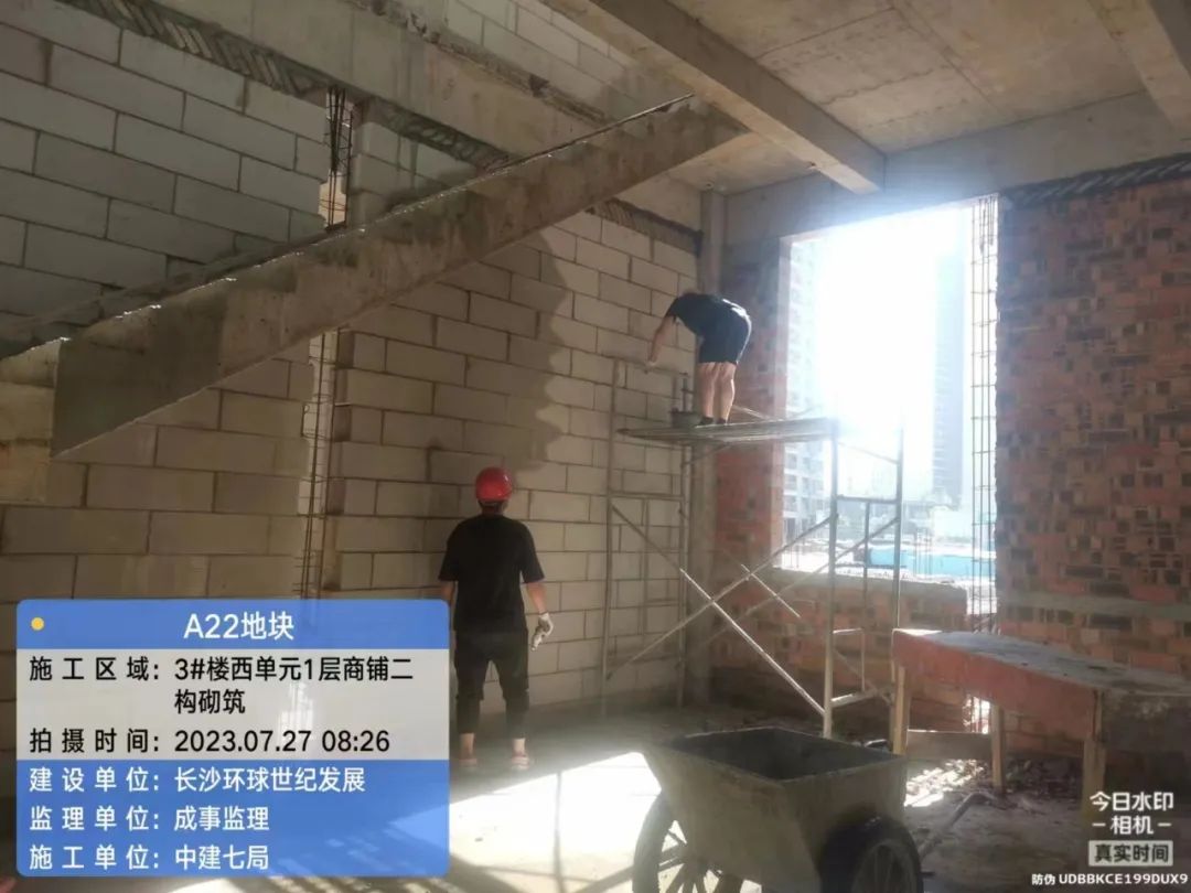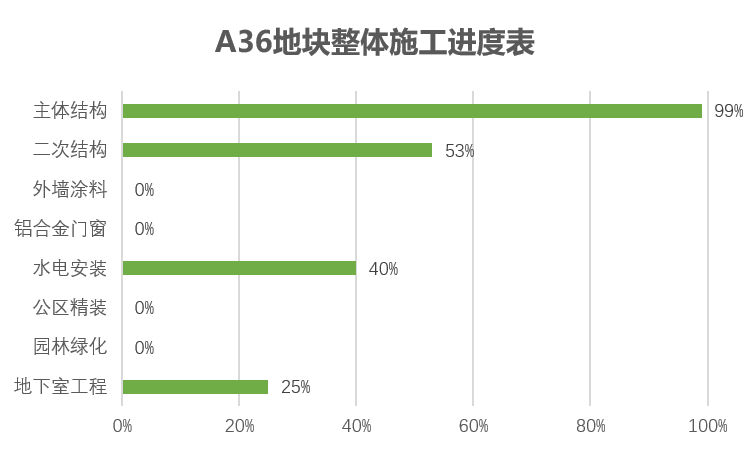 主体结构完成100%;二次结构完成81%(砌筑完成99%;抹灰完成98%;保温完成32%),铝合金门窗、栏杆完成35%;水电安装完成55%;地下室工程完成53%,公区装修完成3%。