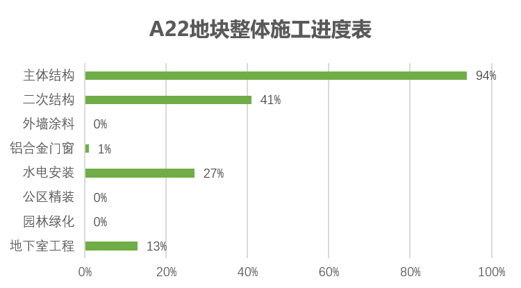 主体结构完成94%、二次结构完成41%、水电安装完成27%、地下室工程完成13%,栏杆完成12%、铝合金门窗完成1%。
