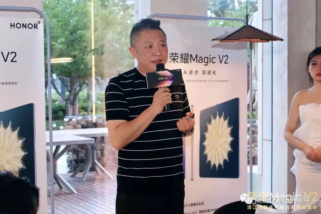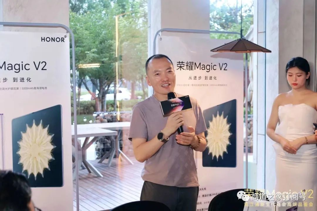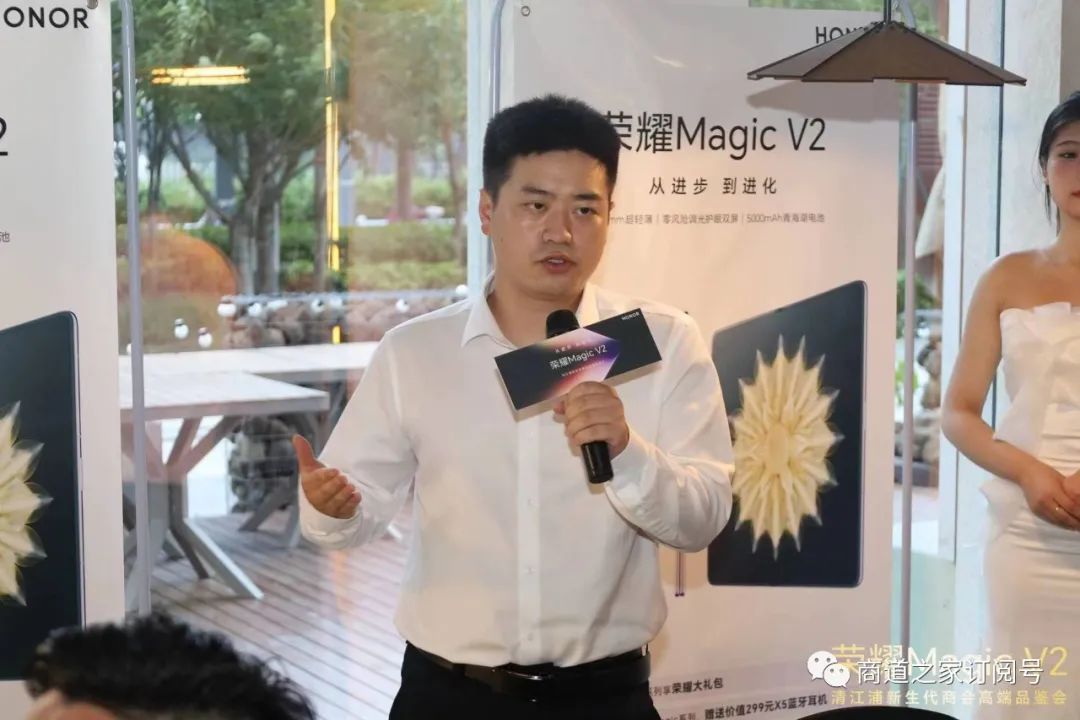 荣耀淮安销售经理高才珂介绍了荣耀的发展史和新款手机荣耀MagicV2的功能特点。他详细介绍了荣耀MagicV2的创新摄影技术、强大处理能力以及智能交互功能,引起了现场观众的热烈反响。