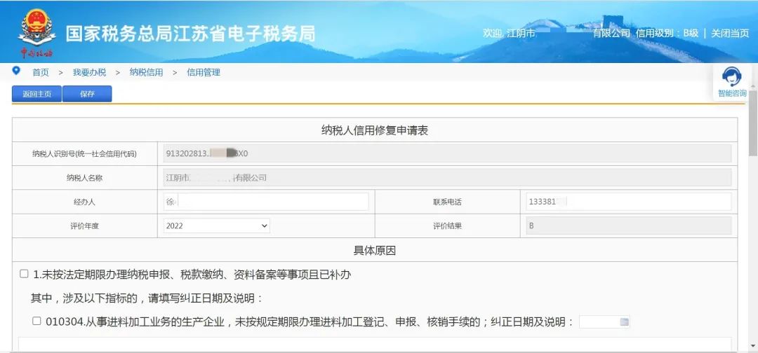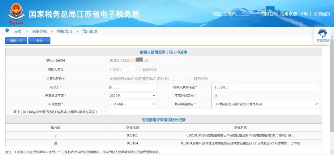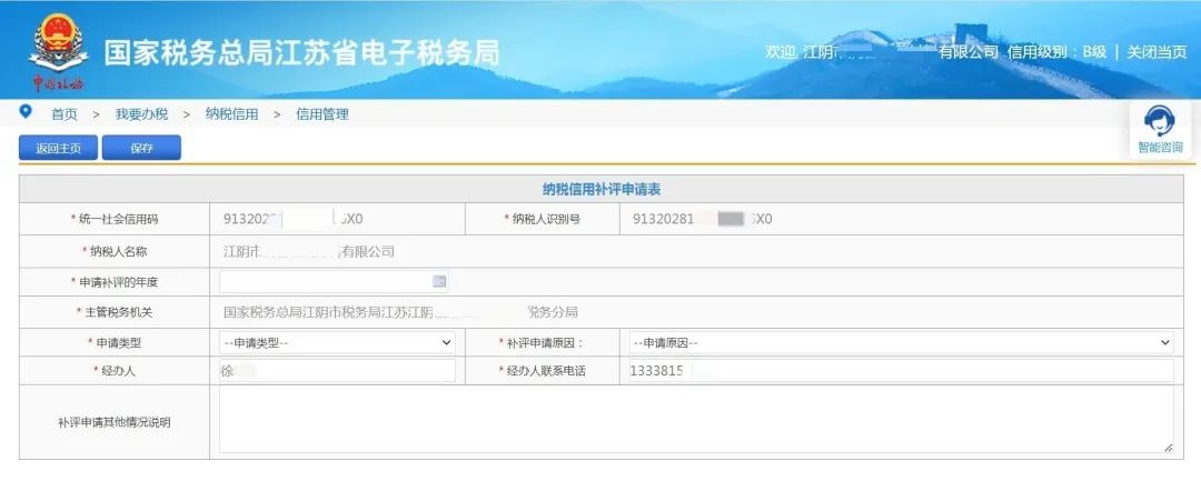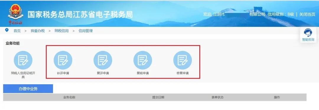 登录江苏省电子税务局,点击“我要办税——纳税信用——信用管理——补评申请/复评申请/复核申请/修复申请”,即可发起对应的调整流程。