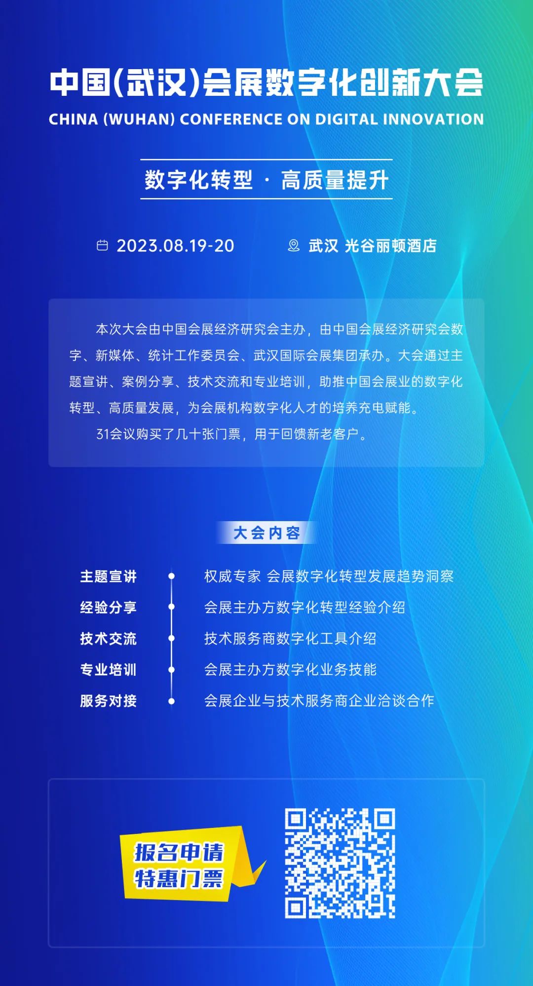 会展数字化聚焦会展数字化转型,提供数字会展洞察、行业趋势、最佳实践案例和知识的分享与交流。关注福利:免费领取《2021-2023中国会展主办机构数字化调研报告》、《数字会展术语白皮书(2023)》、《线上线下融合会展白皮书》详情添加客服微信:19901658209,备注“领取会展数字化报告”,同时,欢迎针对会展数字化主题进行投稿!
