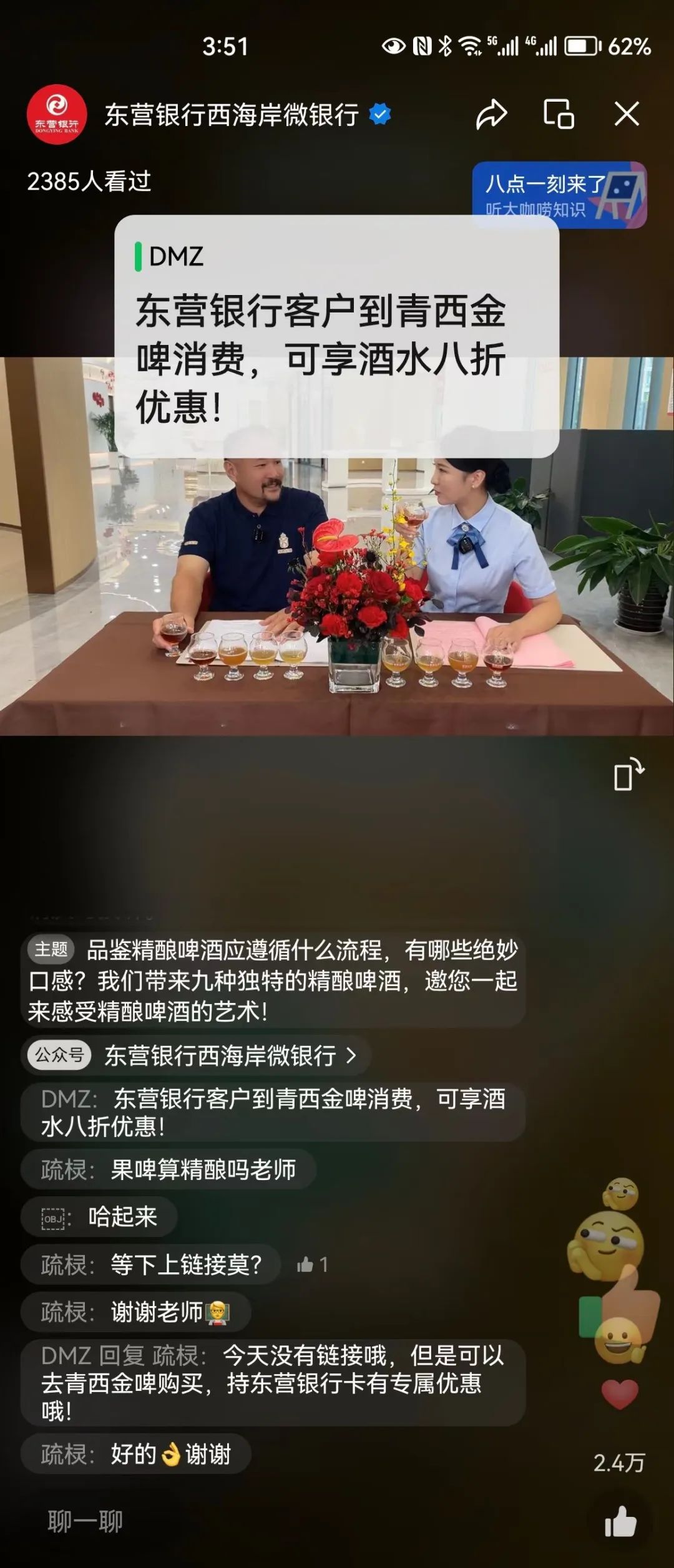 活动现场,东营银行青岛西海岸支行还与青西金啤达成合作,凡东营银行持卡人客户到位于青岛西海岸金沙滩国际啤酒城的青西金啤店内用餐,都可以享受到酒水八折的特别优惠,引起了现场的客户和直播间的网友们热烈回应!