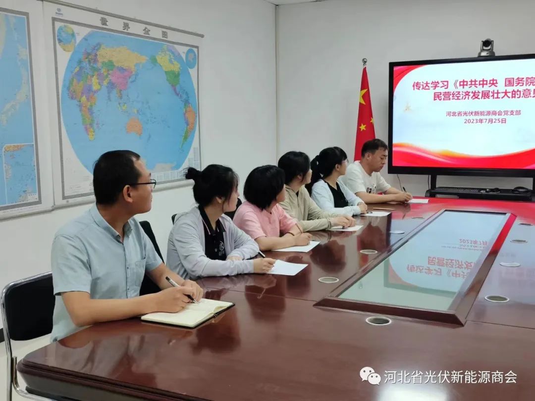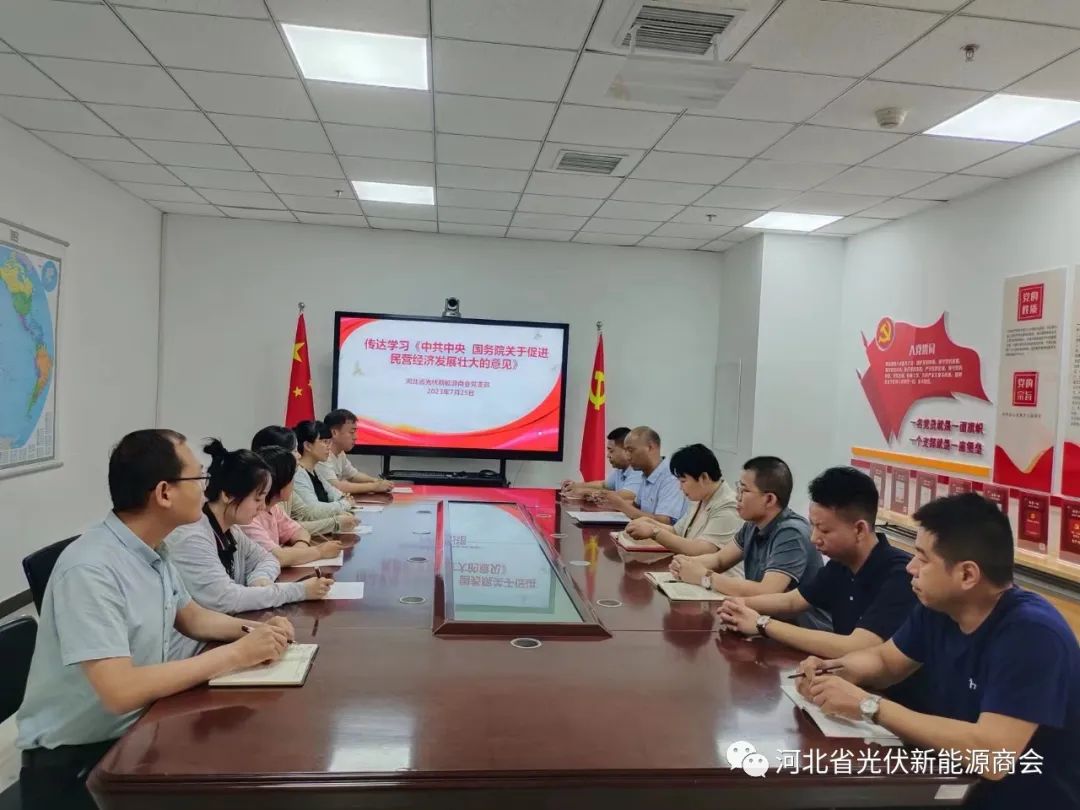 为认真贯彻落实上级精神,进一步提振广大会员企业发展信心,激发昂扬工作精神。2023年7月25日上午,河北省光伏新能源商会组织班子成员和会员企业代表,集中传达学习《中共中央 国务院关于促进民营经济发展壮大的意见》(以下简称《意见》),开展学习交流研讨。会议由商会秘书长、党支部书记马献立主持。