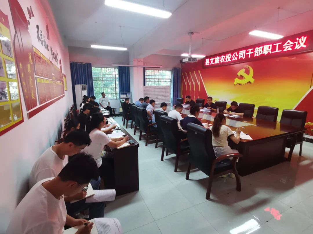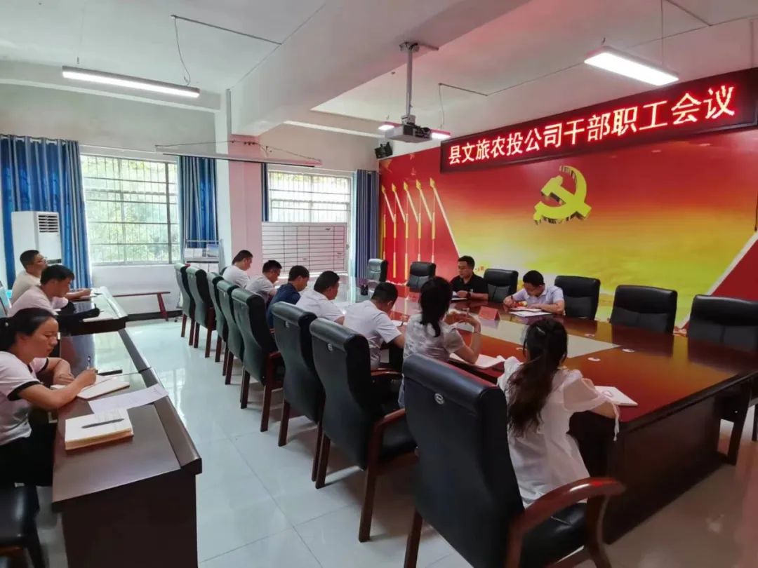 县文旅农投公司在会议室召开干部职工会议,会议由公司董事长赵建宇同志主持,在家干部职工参会。会议传达学习习近平总书记有关重要讲话精神及中央、省、市、县近期重要文件、会议精神,研究公司贯彻落实意见。