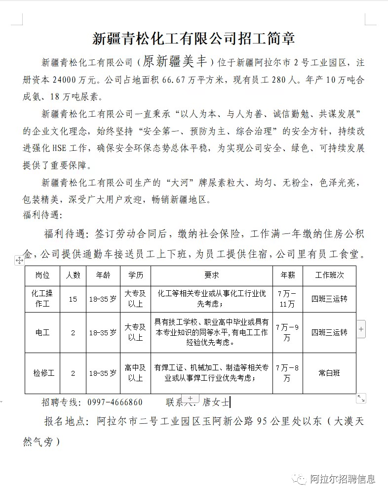 五、气柜操作工:工资:6500+绩效,招聘1人,25—35岁,中专学历及以上学历招聘条件:25-45岁之间,身体健康,有相关岗位工作经验者优先、退伍军人优先、相关化工类学历者优,实习期1—3月,转正后缴纳社保,提供住宿 地址:新疆阿拉尔市第二工业园区。 导航:经二路青松化工电石车间(盛源热电后面,巨科加气块对面) 有意者可致电:17393131548微信同号 致电时间10:00—13:00,下午16:00—19:00