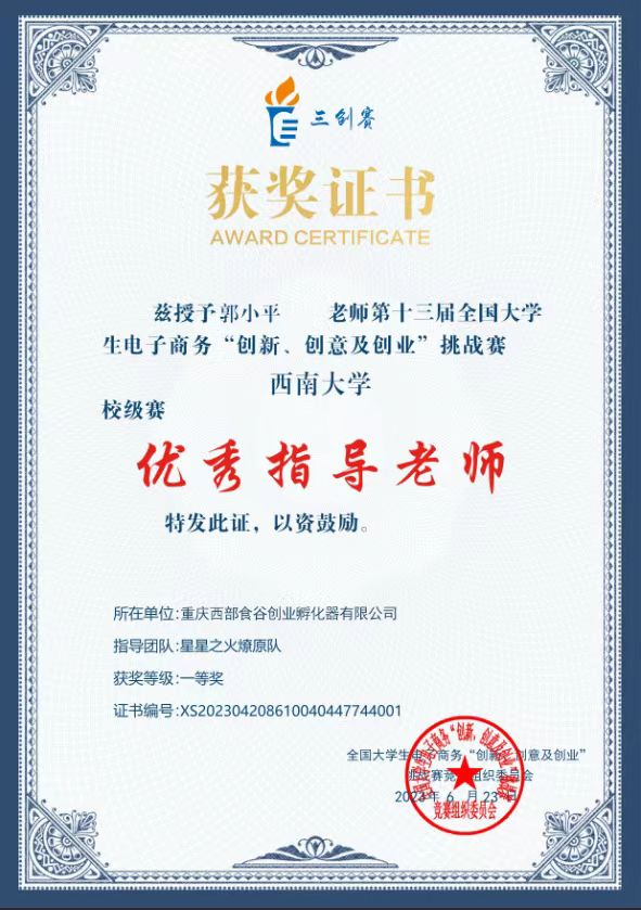 重庆西部食谷创业孵化器有限公司总经理,重庆市人社局高级创业导师、重庆市教委高校大学生就业创业指导专家库专家、重庆市创新创业教育指导专家郭小平作为指导老师指导西南大学“星星之火燎原队”参赛项目“益农科技一一农产品深加工的领航者”荣获第十三届全国大学生电子商务“创新·创意及创业”挑战赛一等奖,并被授予“优秀指导老师”。