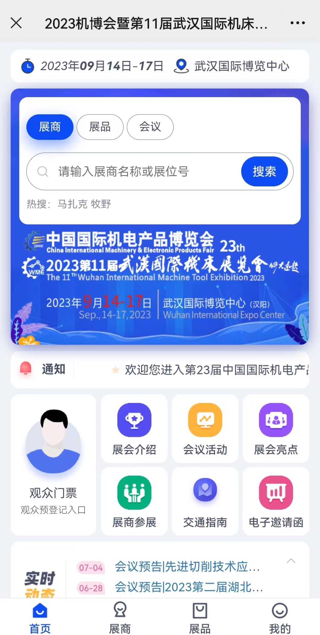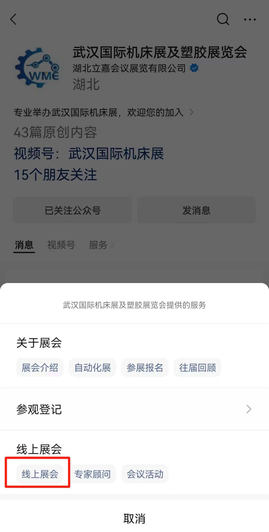 第23届机博会暨第11届武汉机床展·线上展会是汇集展商展品展示、预约洽谈、海报邀约、数据统计、观众报名、图文直播、会议直播、电子邀请函、展商/展品/展位号检索等功能为一体的交互式应用工具,您可以从公众号直接进入线上展,一览展会风采。