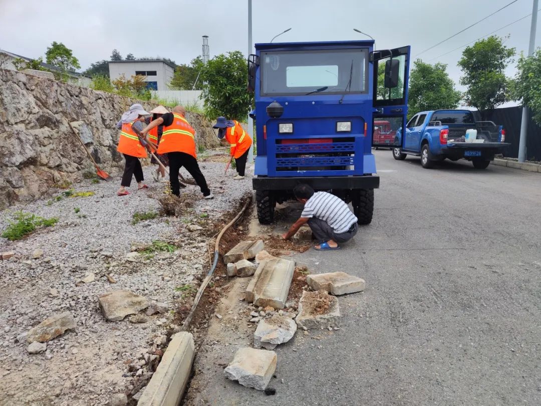 7月28日,兴茂城市服务公司工作人员清理园区路段沙石,为铺设人行道做前期准备工作。