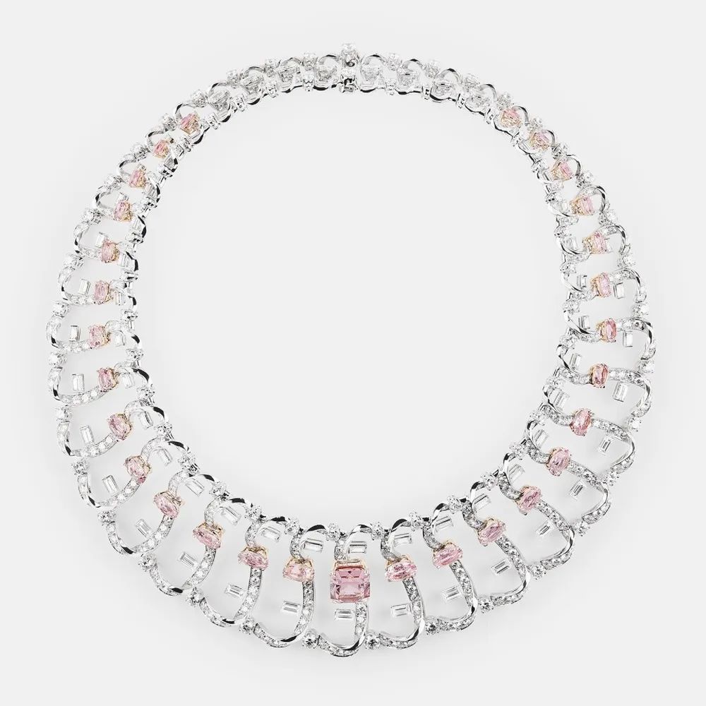 “Roma Rosa”主题中最引人注意的是一件白金项链,圆形和阶梯型钻石构成花体“F”字形链节,亮点是字形中央镶嵌椭圆形和阿斯彻切割粉色尖晶石,柔淡色彩流露出浪漫与怀旧感,同时呼应高级时装中的粉色元素。