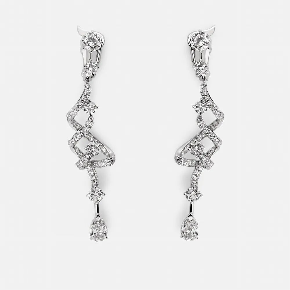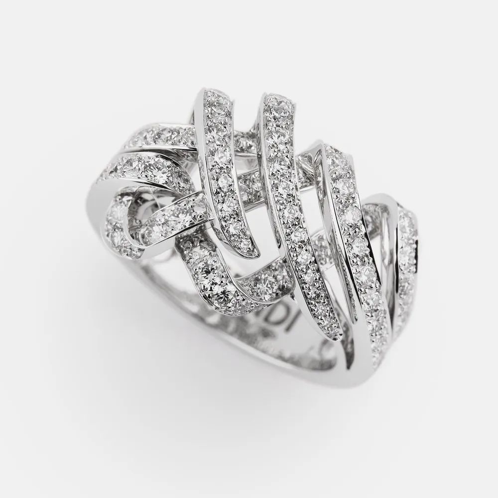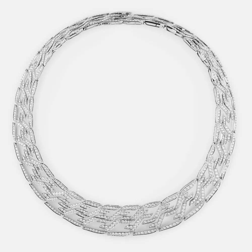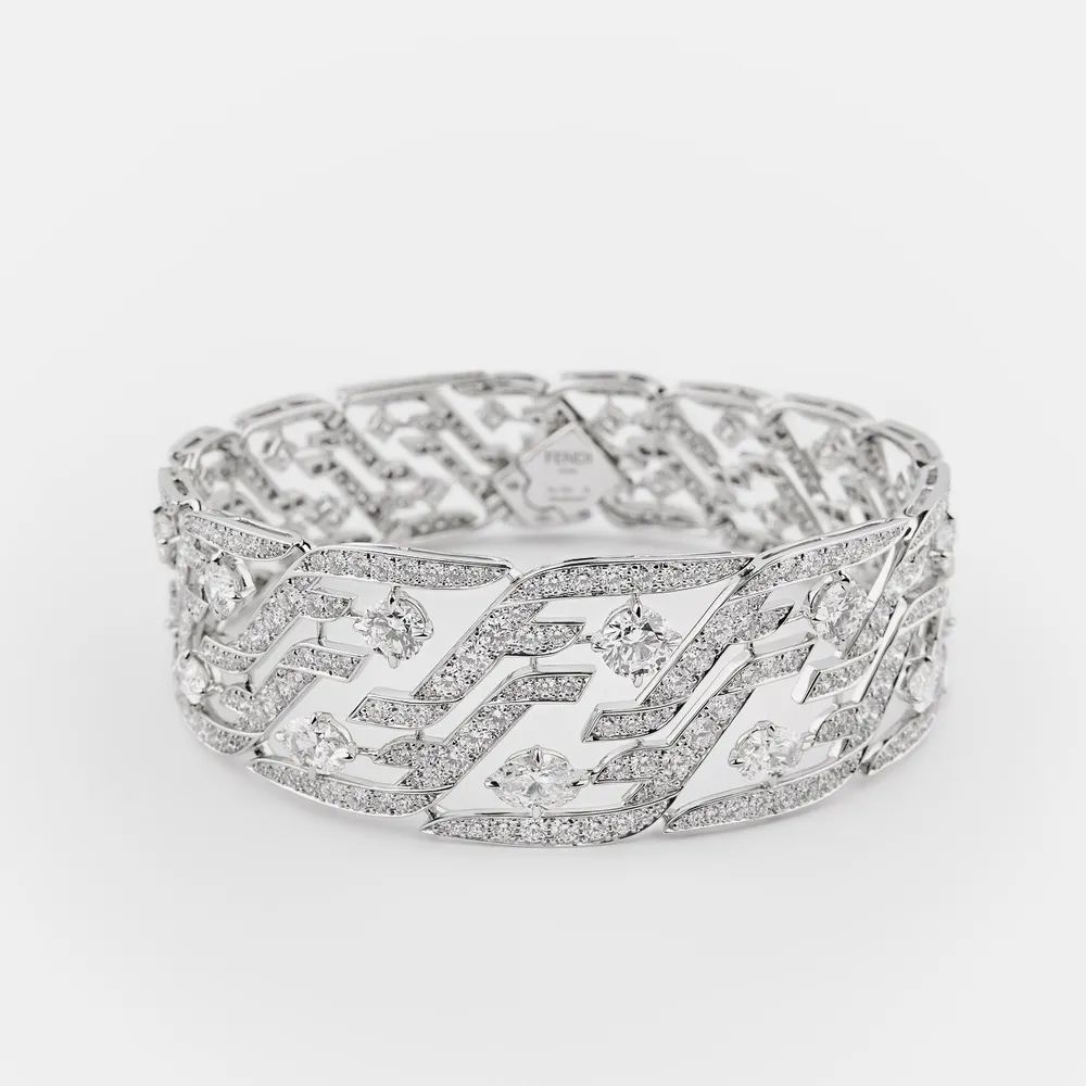 “Bianco Brillante”运用白金和钻石的纯粹搭配,赋予“FF Logo”标志空灵缥缈的诗意气息。可以看到“F”字形交织成立体螺旋结构、镂空四边形等造型,搭配椭圆形、圆形、水滴形等琢型主钻镶点其间,闪耀火彩致敬品牌最经典的徽标符号。