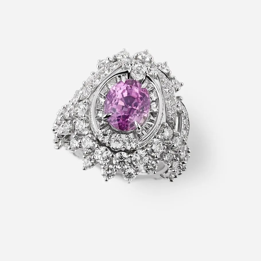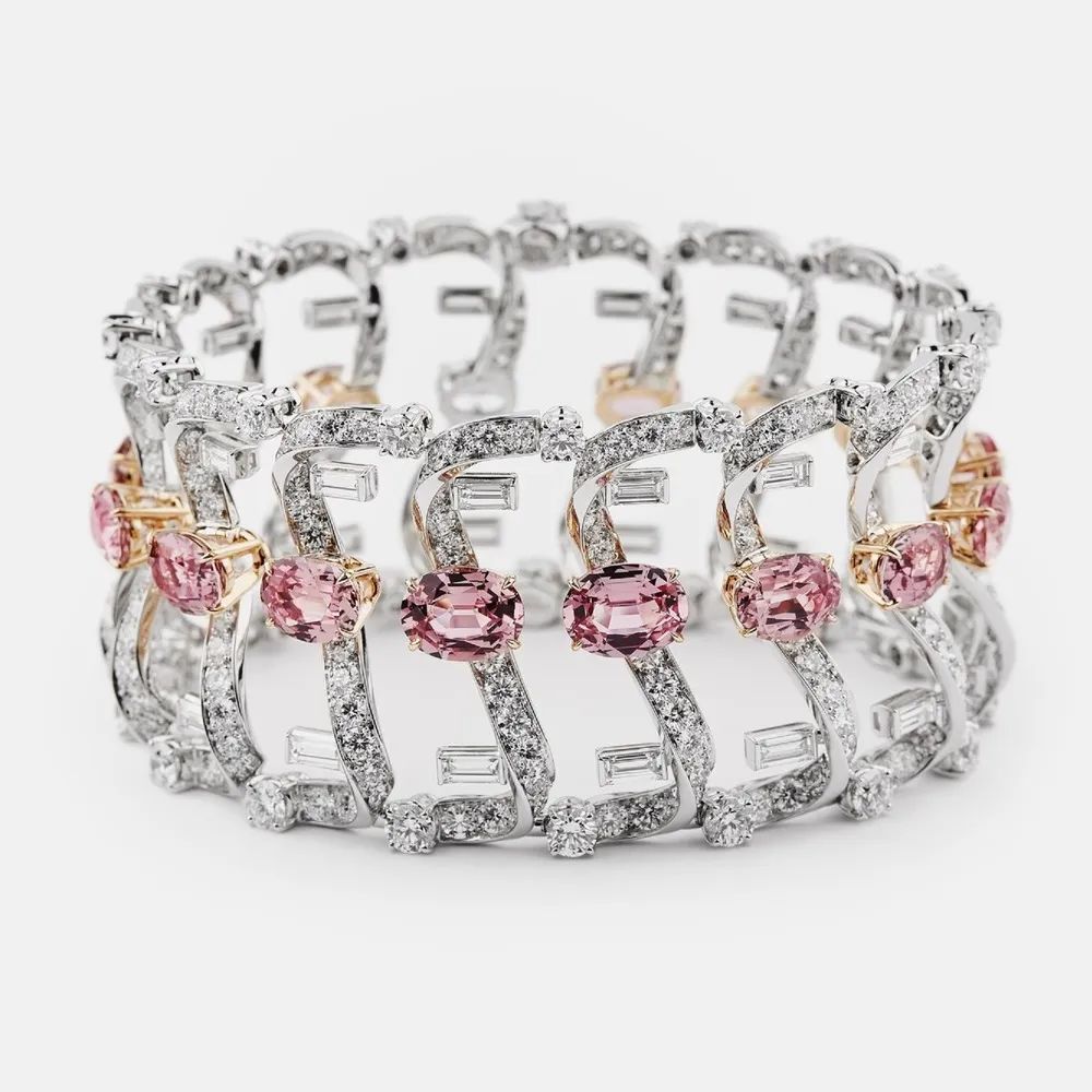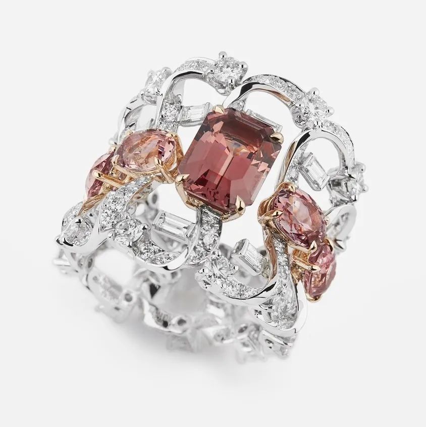 新系列呈现3个主题,“Roma Rosa”主题以粉色蓝宝石和粉色尖晶石为主石,灵感来自罗马城中褪色的大理石、马赛克拼贴画与湿壁画上的纷繁粉色调。