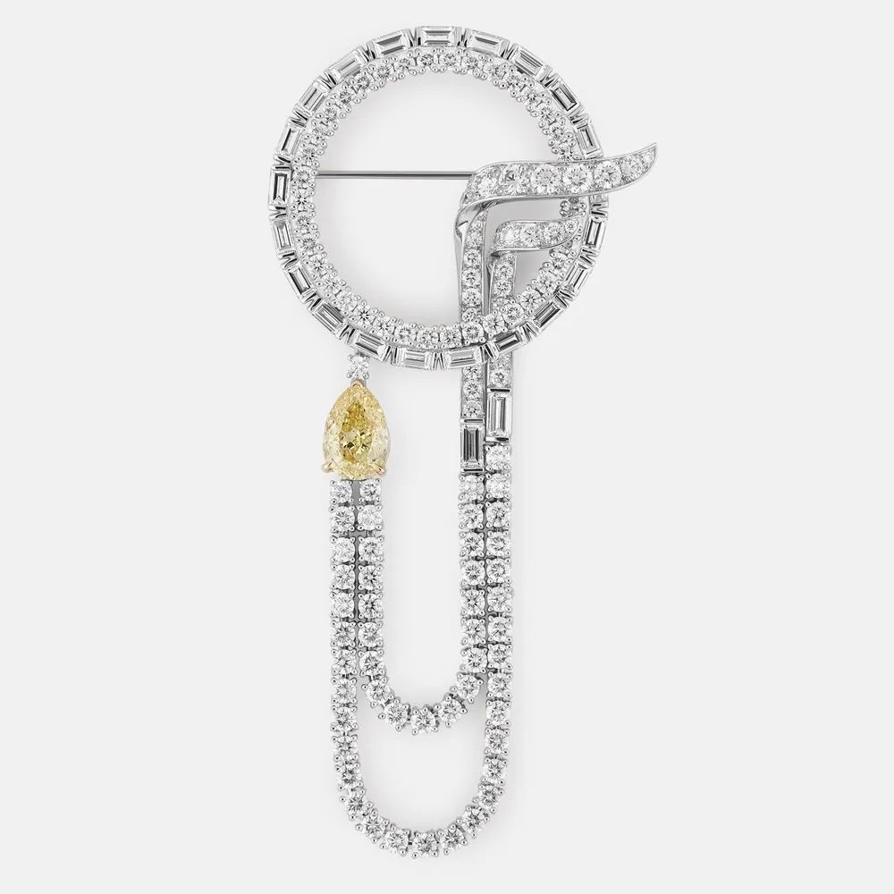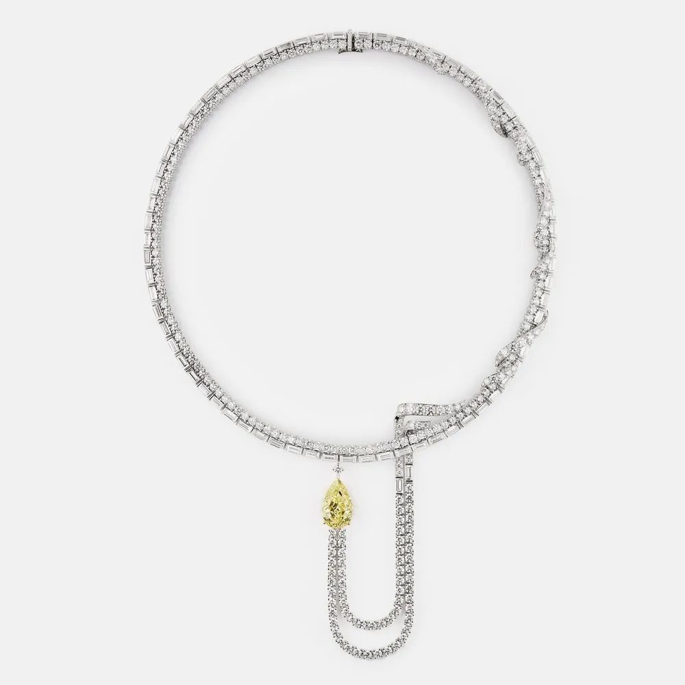 “Gioiello Giallo”主题中最具匠心的是一件项链采用不对称设计,双圈链身镶嵌圆钻和阶梯型钻石。亮点是一枚“F”形图案延伸为灵动双链垂落锁骨之间,左侧镶嵌一颗水滴形黄钻成为瞩目焦点,达到Fancy Intense Yellow浓彩黄色级。