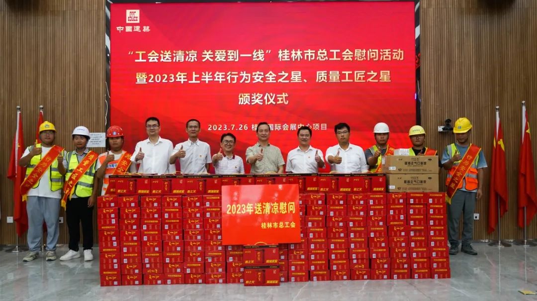 入夏以来,持续的高温天气,给奋战在建设项目一线职工带来了身体和心理的双重“烤”验。为帮助重点工程一线建设者做好高温作业和高温天气作业劳动保护工作,为安全生产保驾护航,2023年7月26日,桂林市总工会开展“送清凉”慰问活动,继2022年“送清凉”慰问后,再次来到桂林国际会展中心项目现场,为高温下坚守岗位的一线职工送去“娘家人”的关怀。