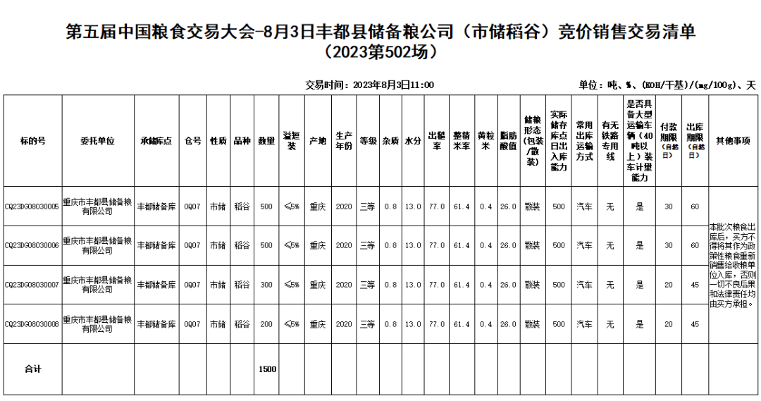 受重庆市丰都县储备粮有限公司委托,重庆市粮油批发市场有限责任公司(即国家粮食重庆交易中心,以下简称“批发市场”)定于2023年8月3日11:00举办丰都县储备粮公司(市储稻谷)竞价销售交易会,现将有关事项公告如下: