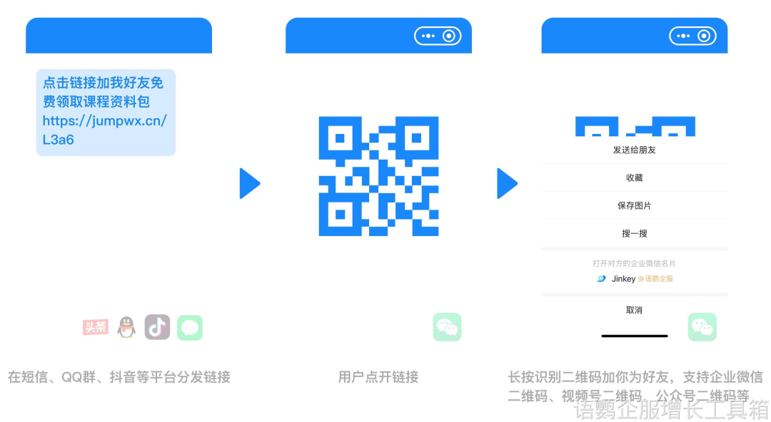如果企业有短信营销的需求,通常是直接把微信号放在短信里,让客户复制微信号,再打开微信的「添加好友」粘贴,进行添加,这整个操作流程很麻烦,转化效果会很不理想。企业可以借助语鹦企服的「加粉链接」功能,创建加粉链接,通过短信文字引导客户点击链接,直接识别二维码加企业微信,减少客户操作流程,提升加粉转化效果。