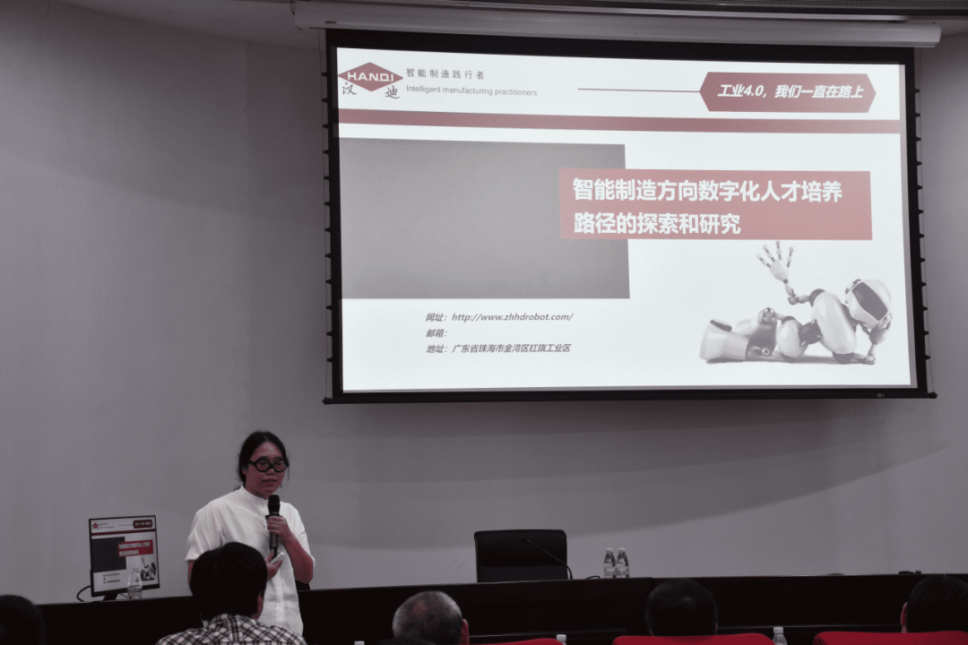 会议安排了主题讲座“智能制造方向数字化人才培养路径的探索和研究”,主讲人珠海汉迪自动化设备有限公司董事长李晓五。她表示,制造业与互联网融合发展已推动全球制造业进入一个升级转型的新时期,企业着力打造“知识+技术+项目”三融合立体化、场景式学习空间,为职业教育数字化改革、创新教育教学生态环境提供智慧实训教学云平台与设备,使制造业能够实时学习并快速适应不断变化的社会需求。
