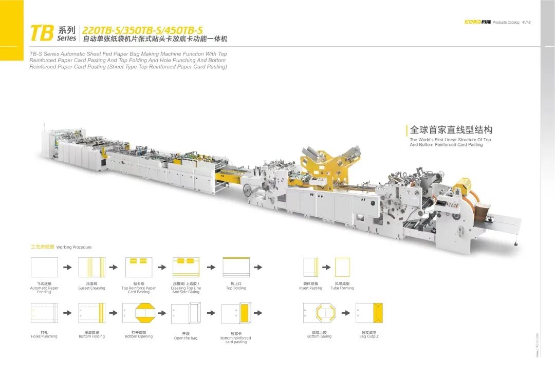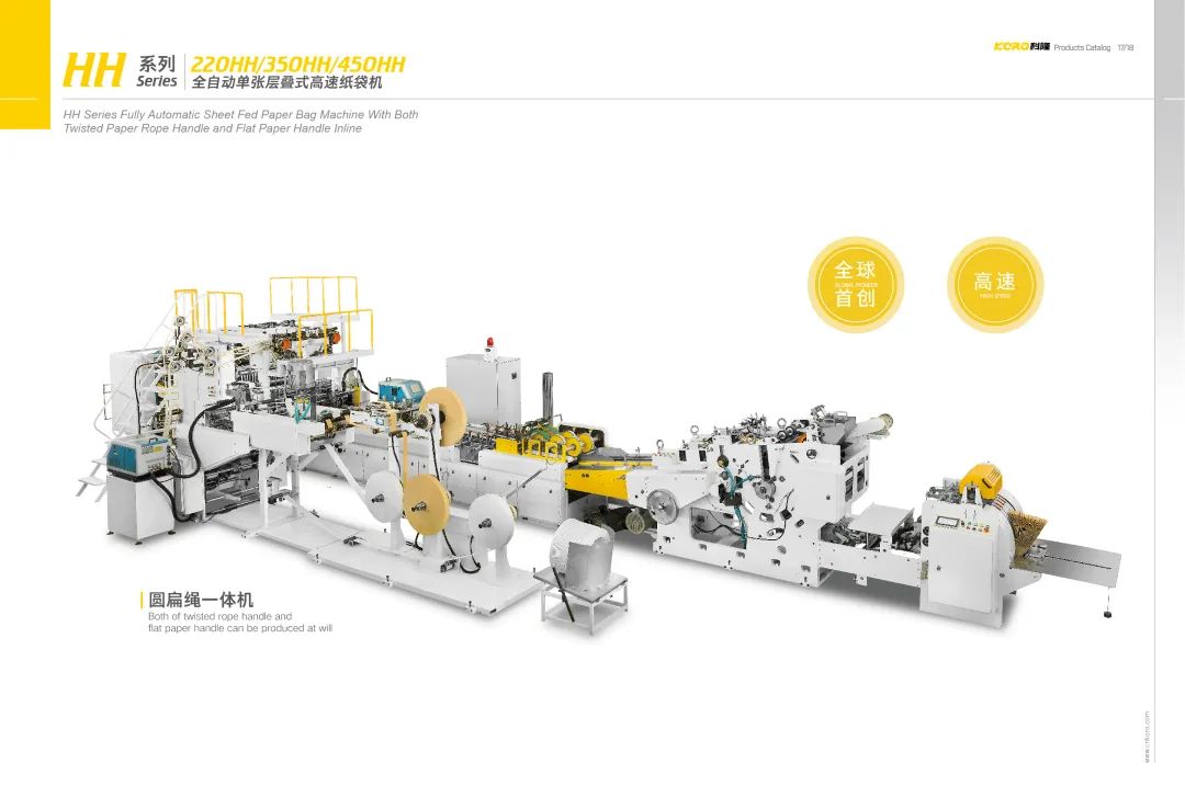 本机以卷筒纸,卷简式头卡和纸绳为原料,一次性完成带把手的手提袋制作。通过在一台机器上完成手把制作、手把粘贴、纸筒成型、纸筒切断、袋底成 型等步骤,真正实现全自动化生产,能够有效的节省成本。本机特别适合用于⻝品和服装行业购物袋的批量生产。