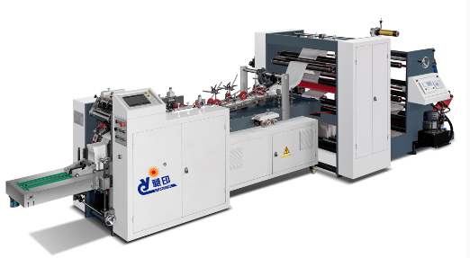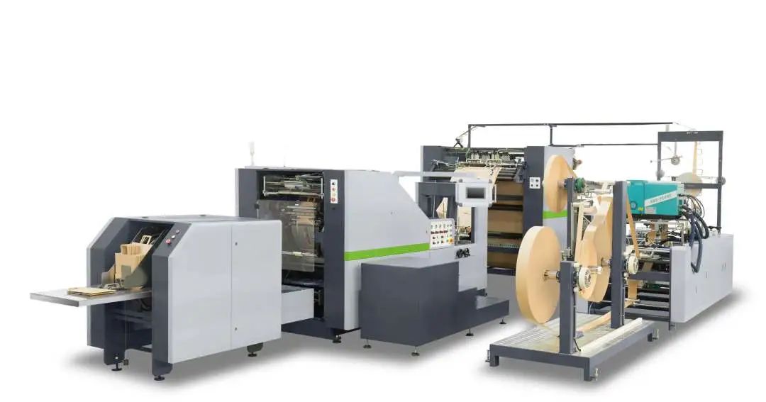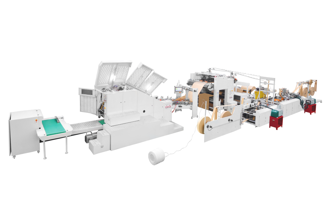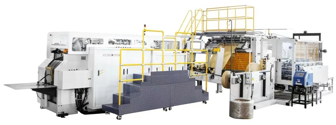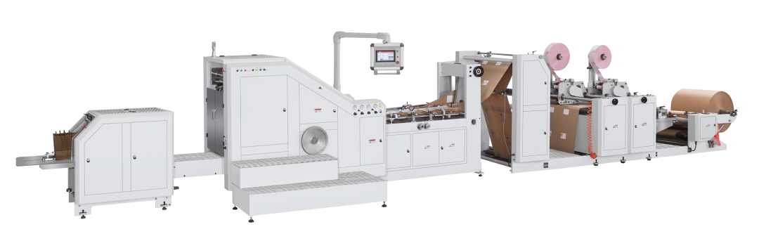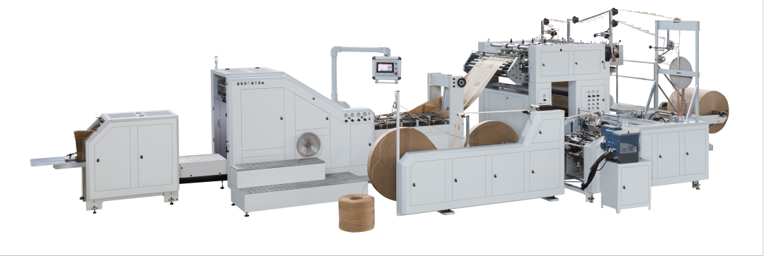 全自动方底纸袋机,用于生产带手挽的手提纸袋(即可做圆绳手提,也可做扁绳手提)。本机特别适用于食品和服装等行业的购物袋批量生产。该机由手挽机将卷绳和纸片卷筒制做成手挽,通过输送系统将手挽送至贴把机组再将原色或印刷好的卷筒纸进行纸绳位预点断、贴片位涂胶、自动粘贴手挽,再由主机将贴有手挽的纸张进行涂边胶、成筒、切断、压痕、底部涂胶、袋底成型并输送出袋,整个过程一次性同步完成。本机采用德国原装进口高速运动控制器(CPU),通过高速总线控制伺服的运行,保证运动稳定,运动曲线平滑,是广大印刷包装厂家首选的全自动手提方底纸袋设备。