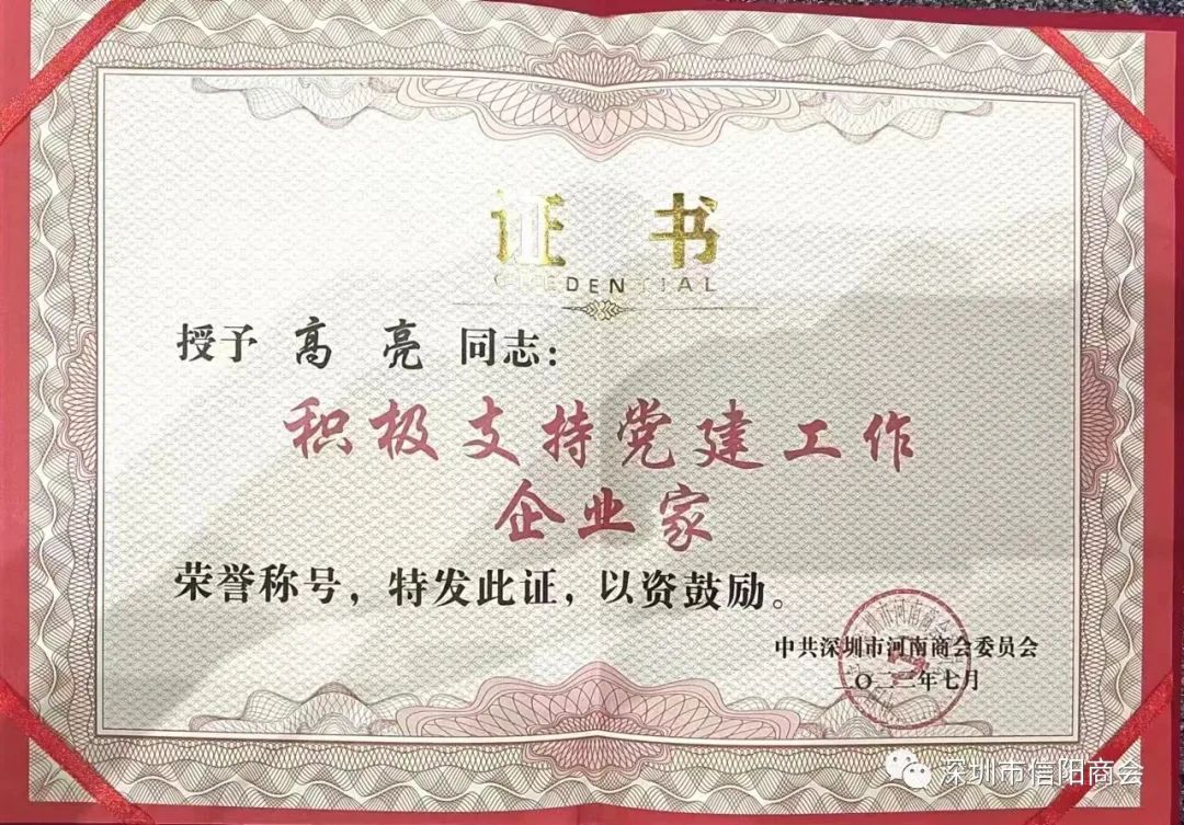 深圳市信阳商会副会长高亮荣获“积极支持党建工作企业家”荣誉称号。
