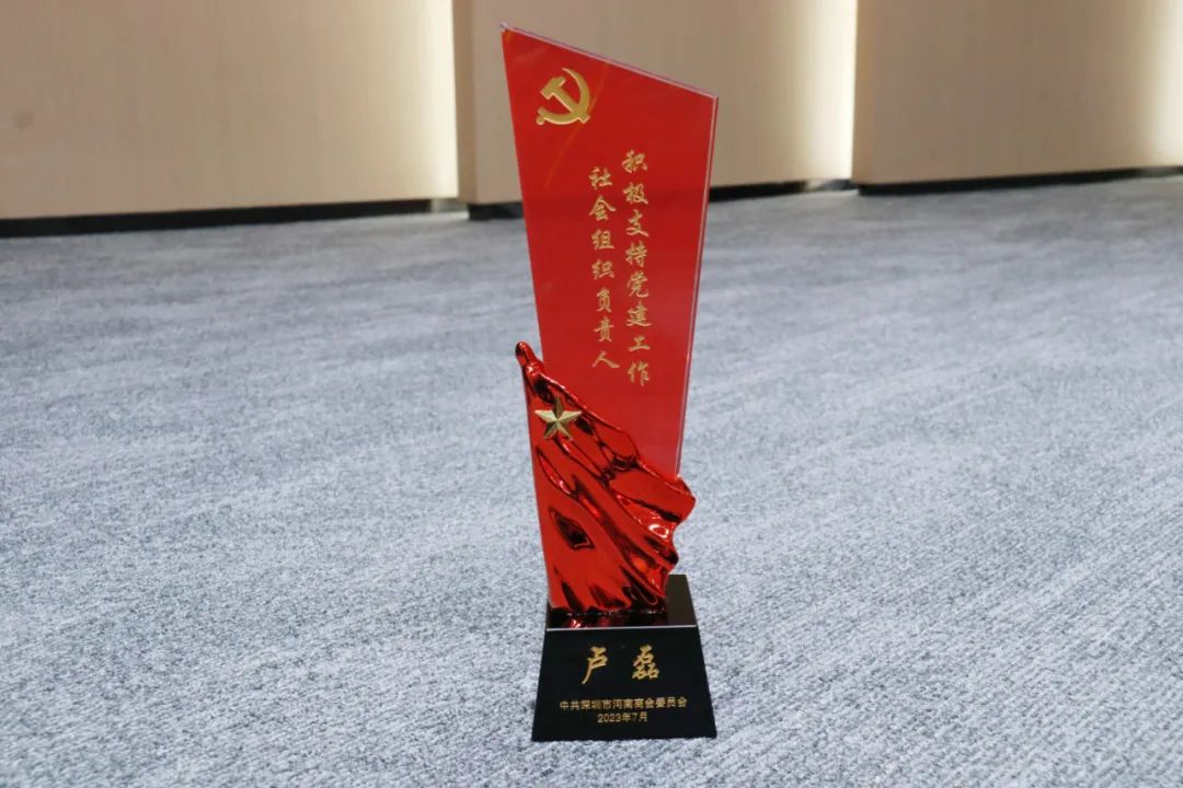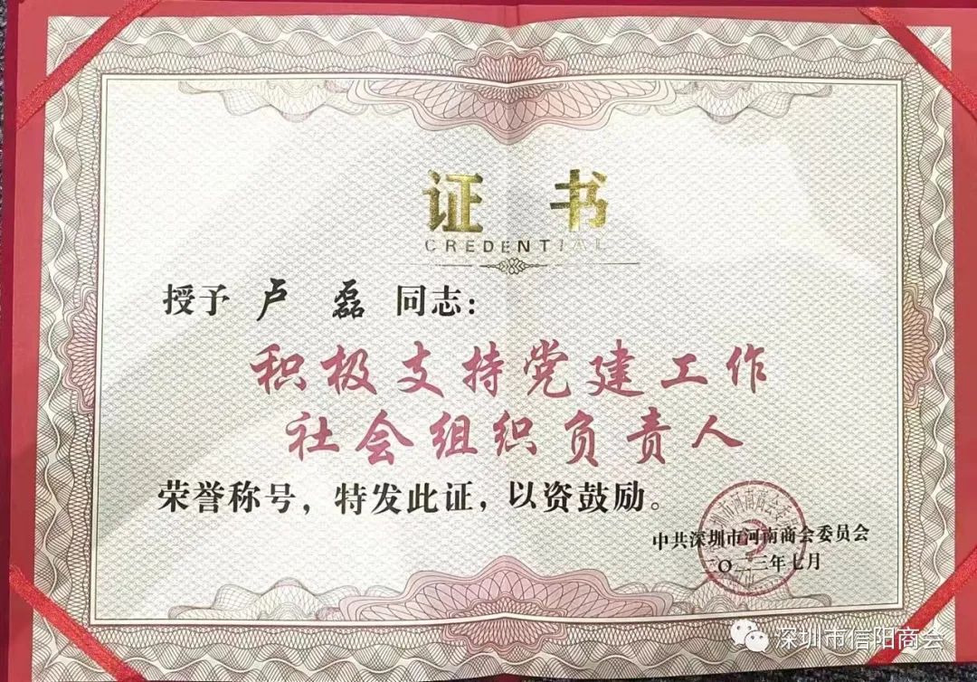 深圳市信阳商会会长卢磊荣获“积极支持党建工作社会组织负责人”荣誉称号。