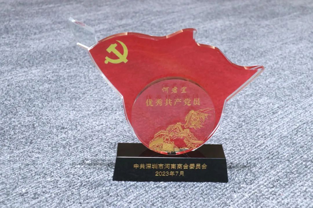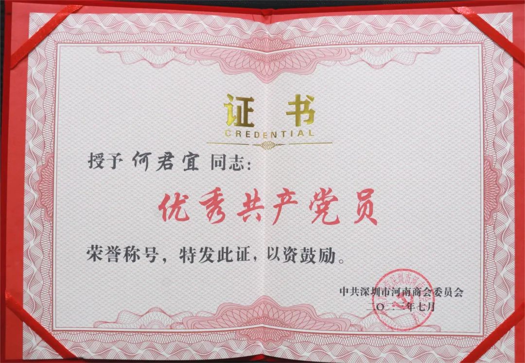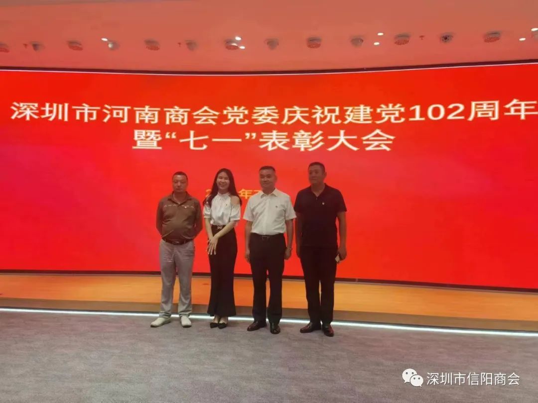 深圳市信阳商会党支部党员何君宜、入党积极分子刘贺、韩强参加此次表彰大会。何君宜荣获“优秀共产党员”荣誉称号。
