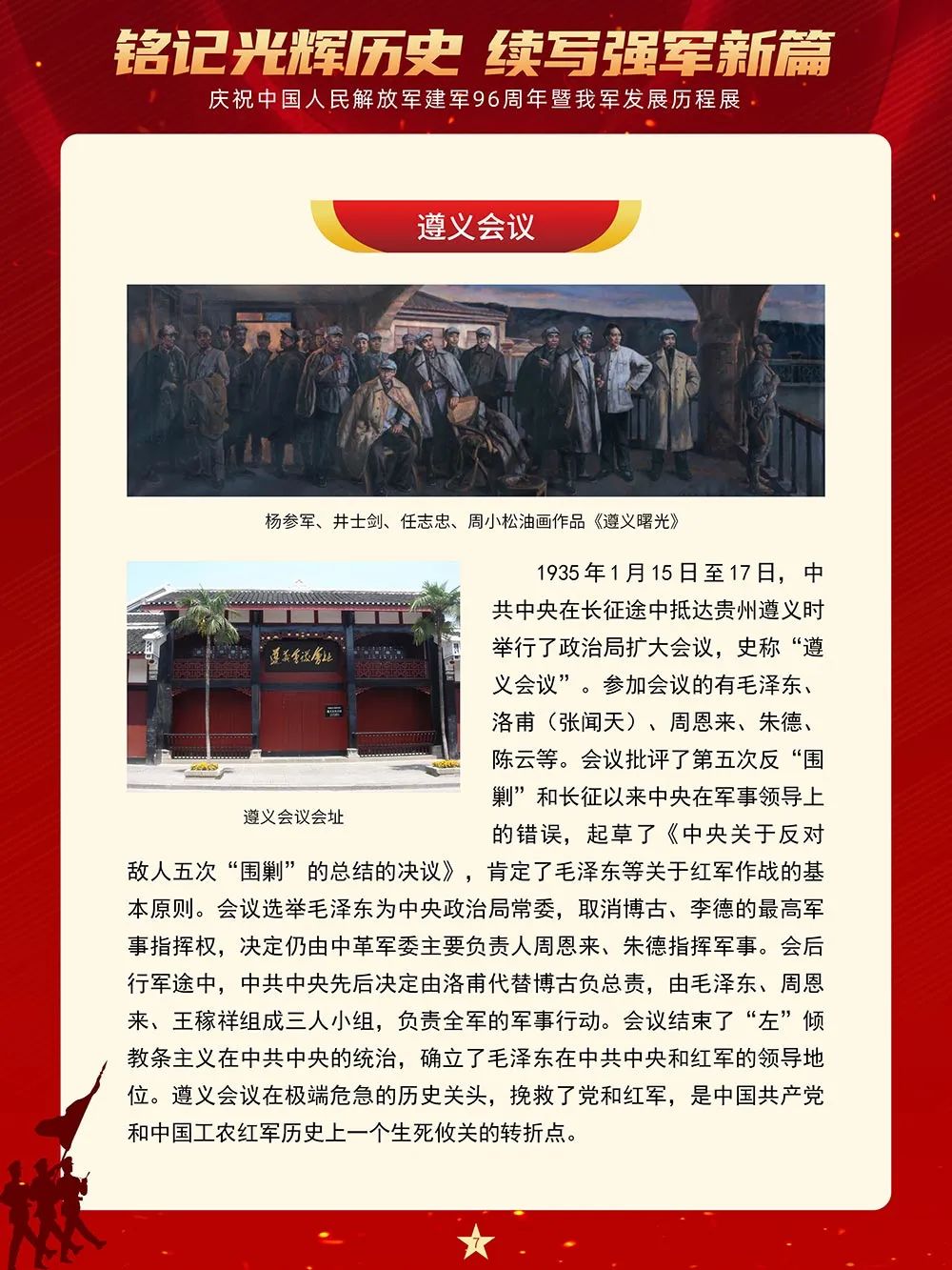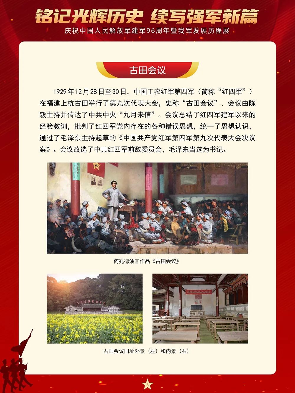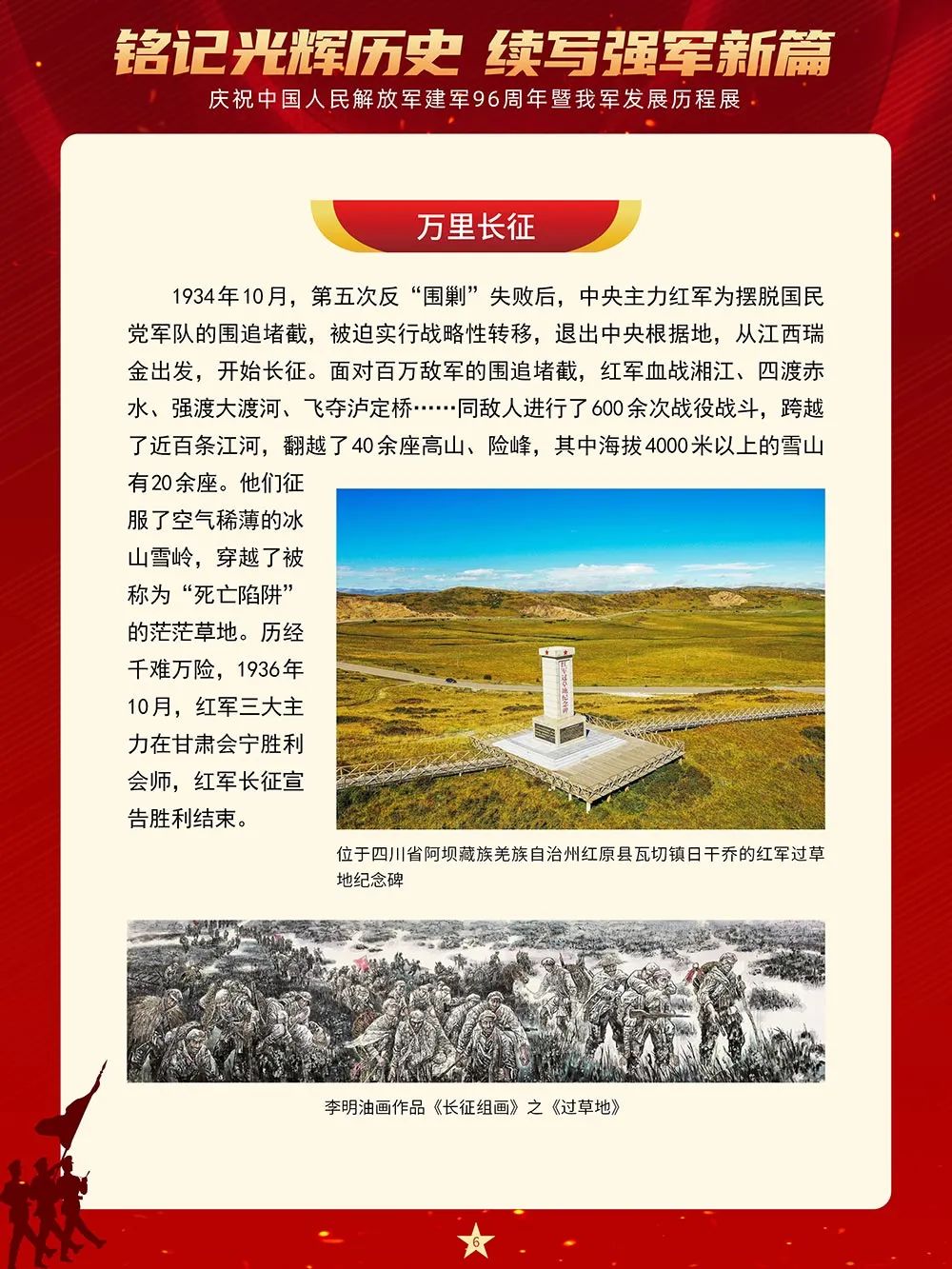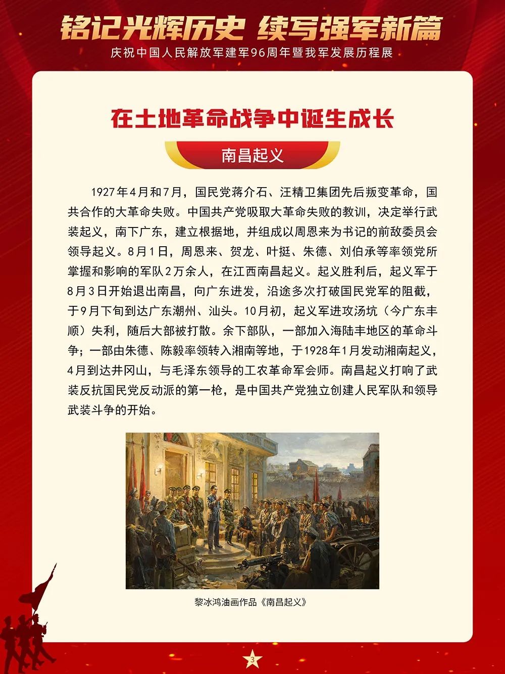南昌城头的一声枪响开启了中国革命新纪元,使中国人民在抗争中凝聚起奋进的力量。从此,人民军队在中国共产党的领导下南征北战,从井冈山斗争到万里长征路,从抗日战争到解放战争,从坚决捍卫国家主权、安全、领土完整,投身国家建设和改革发展,到积极维护地区和世界和平,不断从胜利走向胜利,为国家和民族建立了不朽的功勋。本展览将从“在土地革命战争中诞生成长”“抗日战争的中流砥柱”“夺取全国解放战争胜利”“保卫人民民主政权和建设合成军队”“开创军队建设新局面”等8个部分全面反映96年来人民军队在中国共产党的领导下走过的光辉历程、建立的丰功伟绩。