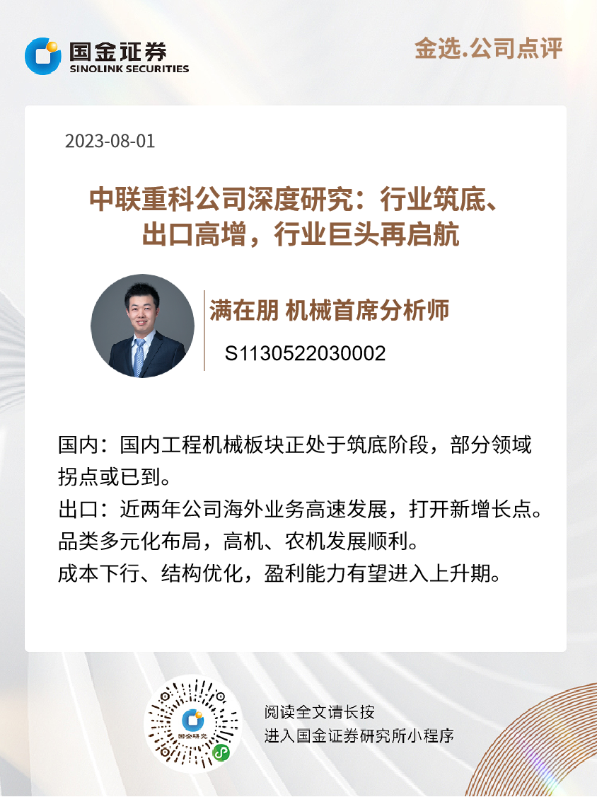2)挖机、混凝土机械:两类产品与地产、基建相关性较高,目前仍处筑底阶段;但随着行业更换周期逐步启动后,挖机、混凝土机械等有望迎来新一轮复苏。公司核心主业为起重机械板块(22年收入占比超45%),有望在国内工程机械上行周期实现率先复苏。