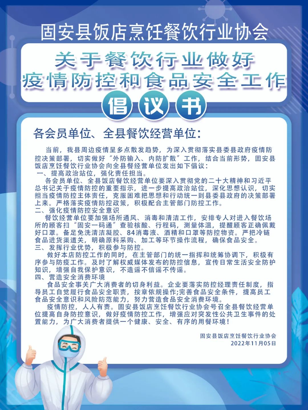 固安县饭店烹饪餐饮行业协会关于餐饮行业做好疫情防控和食品安全工作倡议书