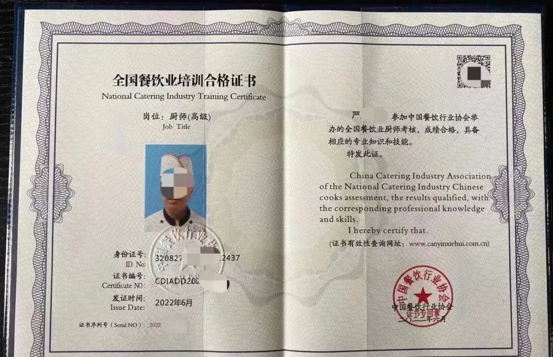 国家一级评委、 营养配餐师、餐饮服务经理、行政总厨、