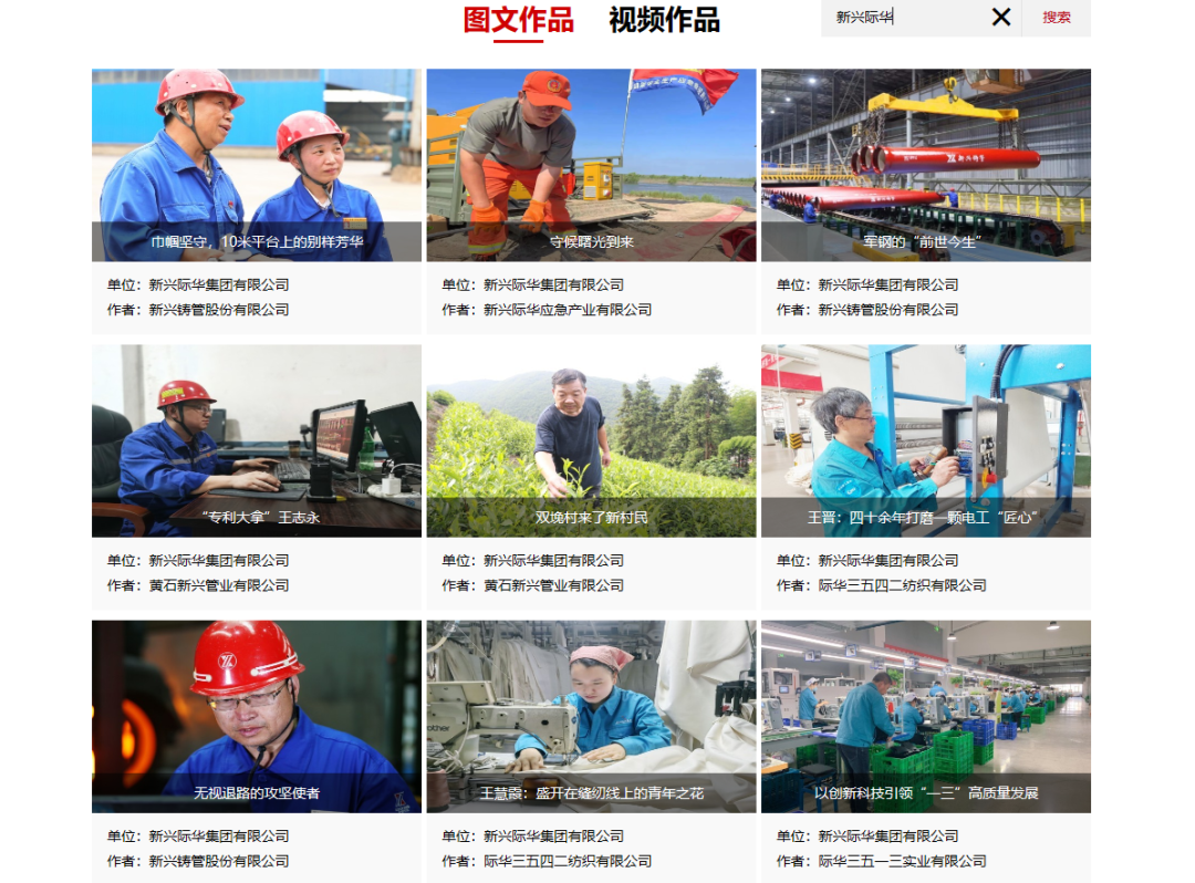 2、进入网站后,在下方搜索新兴际华,即可看到集团公司入选的9部图文作品、3部视频作品。