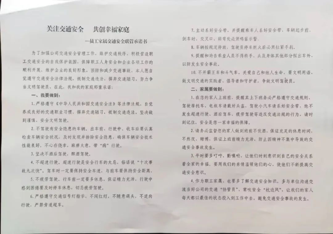 城峰煤业公司将遵守交通安全法律、法规,养成良好习惯,确保员工道路交通安全,作为建设家庭幸福型企业的重要抓手之一,组织全体员工及其配偶共同签订《交通安全家庭互保承诺书》,充分调动员工家属积极性和主动性,形成联保、互保机制,筑牢交通安全基础。
