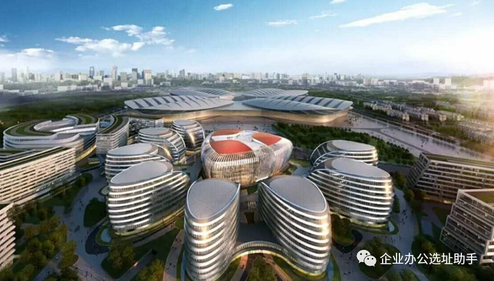 整个规划以呼应国展中心”四叶草”为出发点,神从形似,各个建筑单体以“花心、花瓣、绿叶”的形式有机排列组合,组成“向阳花”的形态,与之轴心对位,构成区域内最具辨识性的建筑群