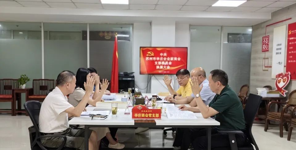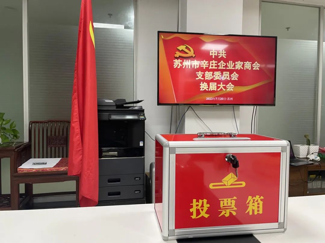 中共苏州市辛庄企业家商会支部委员会在商会会议室召开换届选举会议,王建荣当选新一届党支部书记,市总商会党委书记周洲出席会议并讲话。