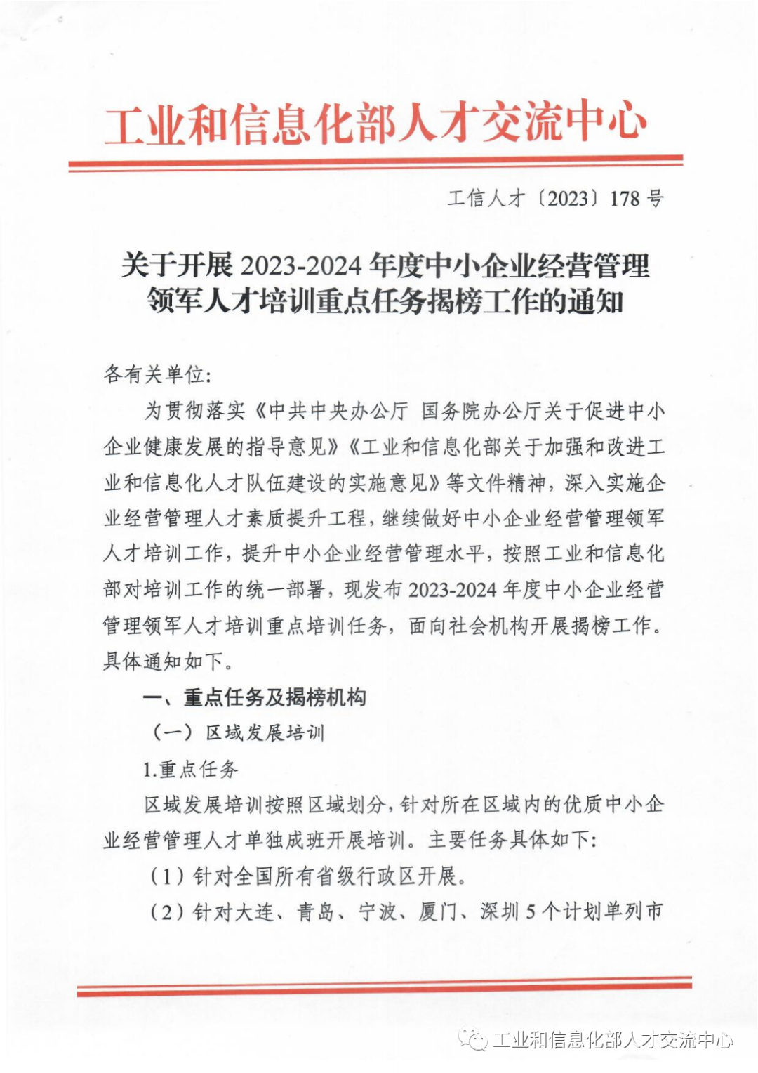 关于开展2023-2024年度中小企业经营管理领军人才培训重点任务揭榜工作的通知