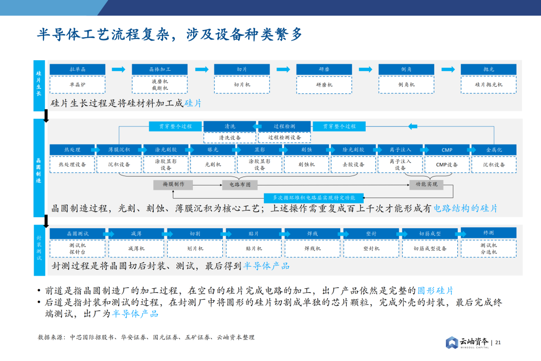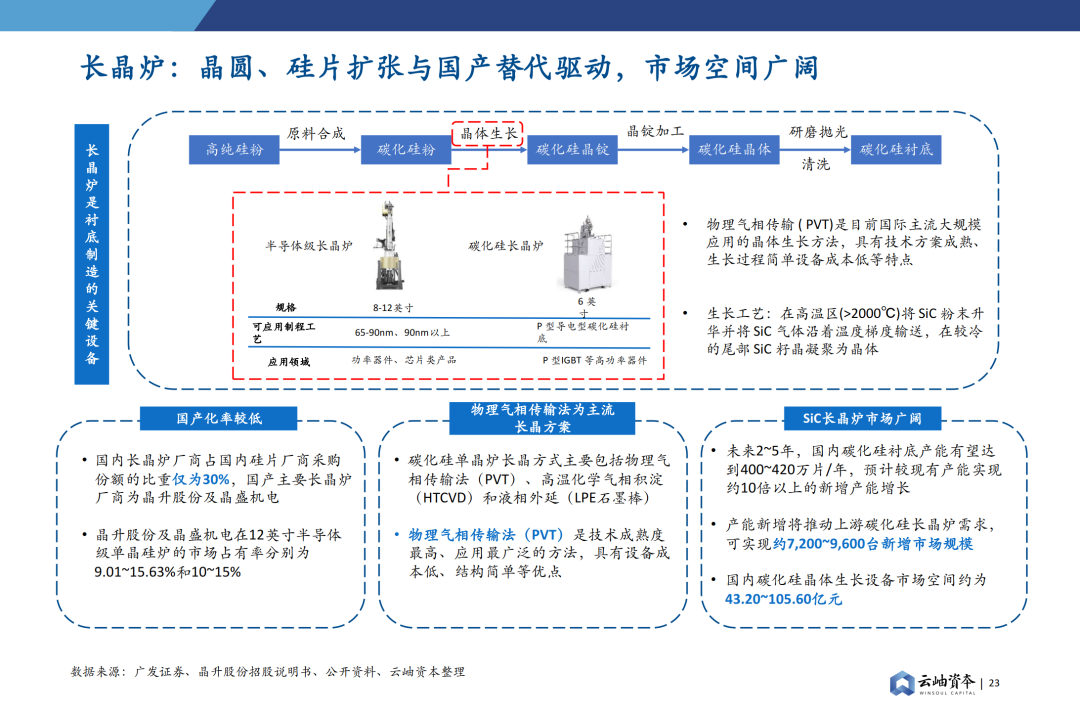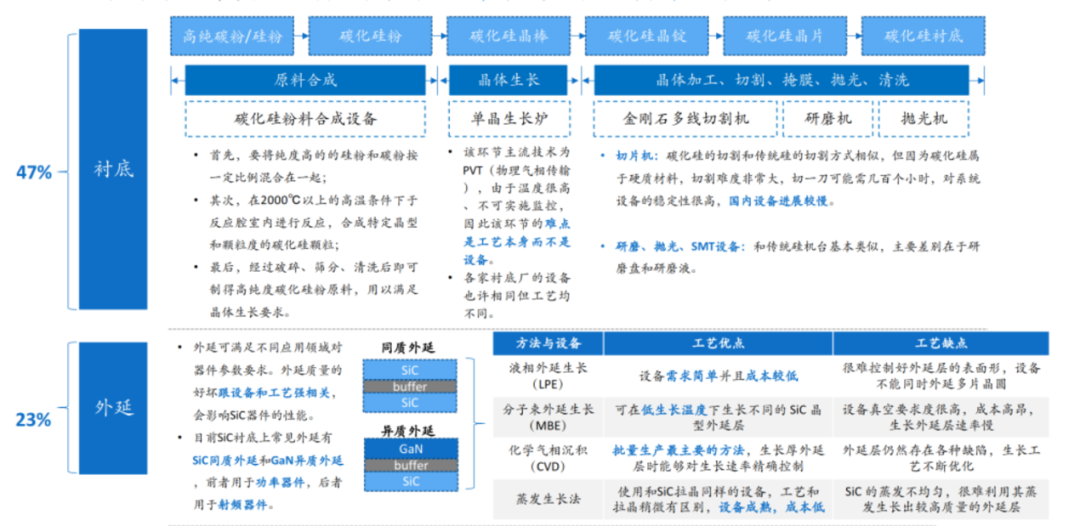 根据SEMI数据,中国大陆市场占比同步提升,2022年已达到26.2%。 国产设备厂高在刻蚀、沉积、清洗、CMP以及测试机、分选机、探针台等核心工艺环节已取得长足进步且与海外传统厂商形成初步的技术对标。但在涂胶显影、离子注入以及光刻机领域差距仍显著,自主可控任重道远。 第三代半导体的快速增长也带来了相关设备投资的窗口。衬底和外延占据三代半价值量制高点,相应的衬底制造设备和外延生长设备具备投资价值。