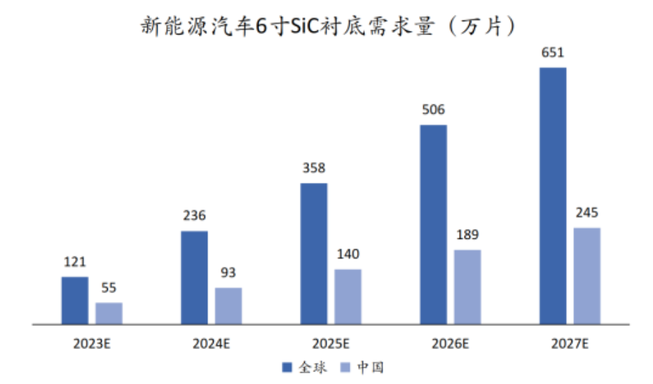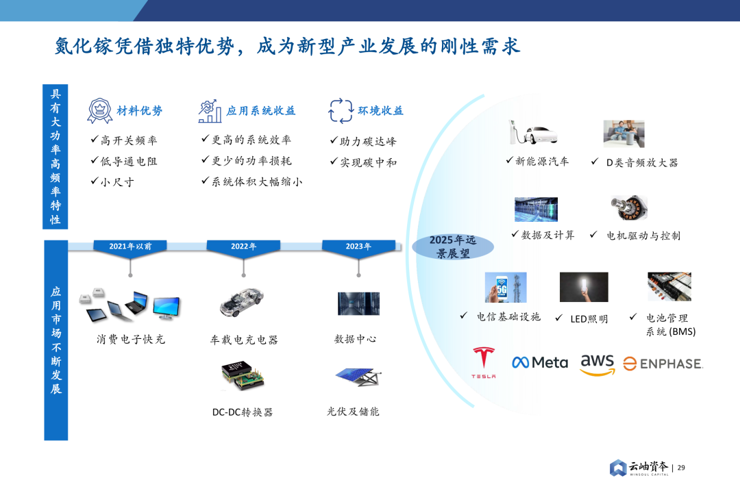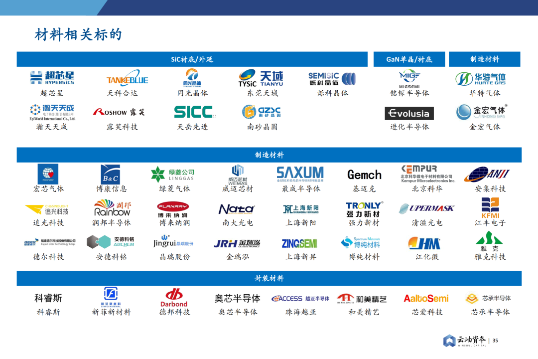 碳化硅衬底材料是碳化硅产业链中最具价值的一环。碳化硅器件制作过程可分为衬底加工、外延生长、器件设计、制造、封装等环节,产业链存在较为显著的价值量倒挂现象,其中衬底制造技术壁垒最高、价值量最大。在碳化硅产业链中,碳化硅衬底约占碳化硅器件成本的47%,而对于硅基器件来说,晶圆制造占据50%的成本,硅片衬底仅占据7%的成本。 碳化硅衬底的核心壁垒在于晶体生长,缺陷控制难度极高。在目前主流的工艺中,PVT法目前仍然存在一定的局限性。该工艺是在一个封闭系统中完成的长晶过程,其监测和控制都具有非常高的难度,这也导致目前的碳化硅晶体很难长厚,良率也一直停滞不前。因此,目前碳化硅的长晶路线仍在不断迭代,业界主要在两种新的长晶路线上进行研发突破。 一种路线是高温化学气相沉积法(HTCVD),最早是在1995年由瑞典林雪平大学的Kordina提出,并已由Norstel实现4英寸衬底的量产。这种方法利用气态的高纯碳源和硅源实现碳化硅晶体生长,生长过程中可以持续通入气体,因此可以实现更高的长晶厚度和更精准的碳硅比控制,同时生长速度也高出PVT法一个量级。 另一种路线是液相法(LPE),但是与硅行业不同的是,碳化硅只有在相当苛刻的高温高压条件下才可能呈现液态,因此目前碳化硅液相法使用的并不是碳化硅溶液,而是在硅溶液中通过金属助溶剂溶解碳进而长出晶体,但金属助溶剂的使用会导致晶体残留金属杂质,不能用于后续器件的制作,因此液相法目前还处在发展早期。 目前,全球碳化硅衬底正面临极度的供不应求。事实上,我们认为这也是特斯拉不得不寻求减少碳化硅用量的直接原因。如果按照1片6寸衬底供给2辆新能源汽车来计算,那么2022年特斯拉130万辆的产销就需要65万片6寸碳化硅衬底,同期全球碳化硅衬底产能不过80-100万片;如果考虑到一部分衬底只能用来做工规级产品,那么目前全球产能也只能勉强满足特斯拉一家车企的需求;而特斯拉计划2030年实现2000万辆的年产能,相当于1000万片的衬底需求,这需要全球衬底产能扩大10倍以上。 即使考虑到单车碳化硅用量可能的减少,根据云岫资本测算,到2027年,全球车载碳化硅衬底需求量仍会突破650万片,其中中国市场需求也将突破240万片,当前产能仍有6倍缺口。 当前,导电型SiC衬底主要还是由国外厂商为主导,国内天科合达和山东天岳在全球市占率分别仅为2%和1%,国产替代空间广阔。 而在半绝缘性SiC衬底行业,全球市场出现三足鼎立的局面,国内山东天岳成为全球市场龙头,全球市占比高达30%。Semiconductor material-GaN 氮化镓材料具有高开关频率、低导通电阻、小尺寸等优势,可以实现更高的系统效率、更少的功率损耗和更小的模块体积,在功率器件领域相较硅材料优势明显。最早,氮化镓材料大范围用于消费电子快充,目前正在向汽车、数据中心、光伏储能等领域渗透,未来市场将持续稳定增长。 国内氮化镓行业持续高速增长,2026年有望实现千亿市场规模。目前国内创业公司众多、行业集中度相对分散,但是以英诺赛科为代表的GaN IDM公司优势明显,不仅可以广泛覆盖不同的下游应用场景并自主掌握工艺和产能保障,未来也将持续提升市场份额。 IC 载板又称封装基板,是连接并传递裸芯片(DIE)与印刷电路板(PCB)之间信号的载体,可理解为一种高端PCB 产品。 IC 载板的功能主要是保护电路、固定线路与导散余热,是封装制程中的关键部件和最大的成本端,其在低端封装中成本占比40- 50%,高端封装中占比70-80%。 在高阶封装领域,IC 载板已替代传统的引线框架。