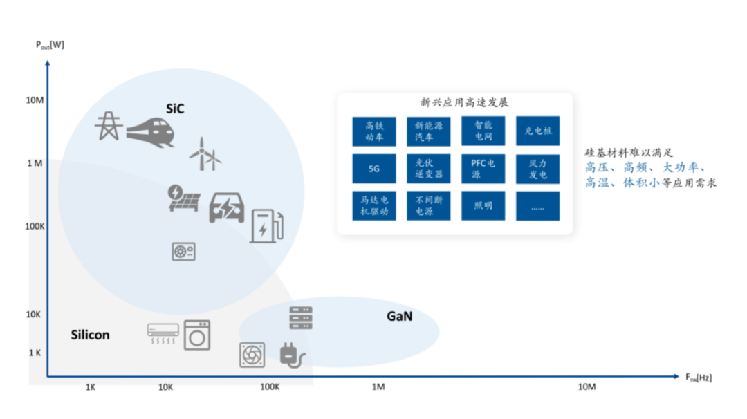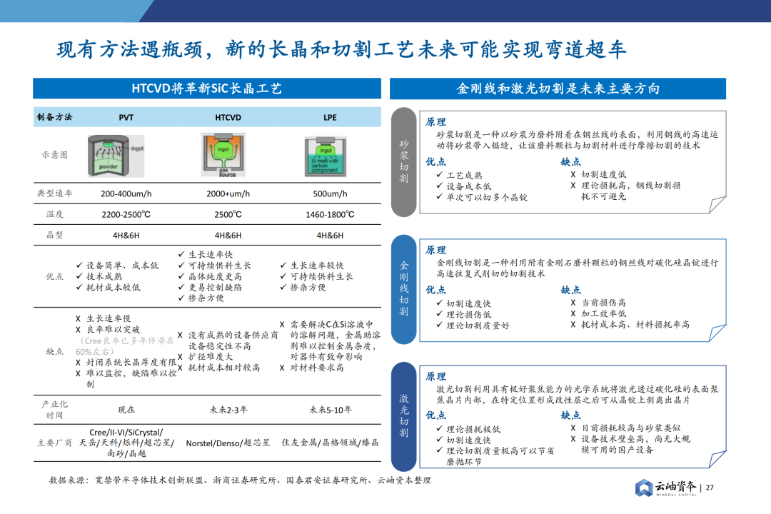刻蚀是用化学或物理方法对衬底表面或表面覆盖薄膜进行选择性腐蚀或剥离的过程。目前干法刻蚀在半导体刻蚀中占据绝对主流地位,市场占比超过 90%。同时,等离子刻蚀是晶圆制造中使用的主要刻蚀方法,电容性等离子刻蚀(CCP)和电感性等离子刻蚀(ICP)是两种常用的等离子刻蚀方法。随着当前集成电路技术的不断发展,构成芯片的核心器件尺寸持续缩小,芯片的加工制造变得越来越精细。原子层刻蚀(ALE)能够精确控制刻蚀深度,成为未来技术升级趋势。Semiconductor material-SiC 第三代半导体是以碳化硅和氮化镓为代表的宽禁带半导体材料,具备高频、高效、高功率、耐高压、耐高温、抗辐射能力强等优越性能,是支撑新能源汽车、光伏储能、高速轨交、智慧电网、新一代移动通信等产业持续发展的重点核心材料。 (图源:云岫资本)