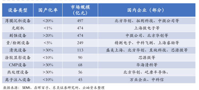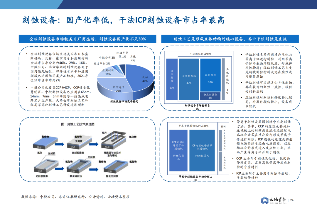 刻蚀设备作为半导体设备的中坚力量,有望率先完成国产替代。随着半导体制程的微缩和结构的复杂化,半导体刻蚀设备的种类和技术难度递增。从国内市场来看,刻蚀机尤其是介质刻蚀机,是我国最具优势的半导体设备领域,也是国产替代占比最高的重要半导体设备之一。