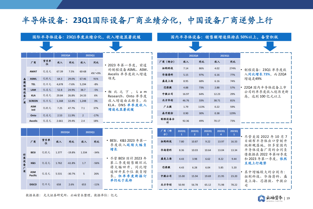 设备和材料是半导体产业链的关键上游,随着半导体制造市场的增长而增长。2022年以来外部环境对国内半导体的监管日益加强,美日荷先后对半导体出口进行管制,业绩上来看半导体行业国际设备厂商周期下行,但中国设备厂商逆势上行。国内半导体板块整体23年Q1业绩承压,半导体设备板块业绩表现亮眼。 当前半导体设备的国产化率还非常低,而中国大陆半导体制造占全球比重很高,因此半导体设备还有很大的国产替代空间。另一方面国内政策大力扶持,在此背景下国内晶圆厂有望加大国产半导体设备、材料的使用规模,国产替代也正在加速进行中。