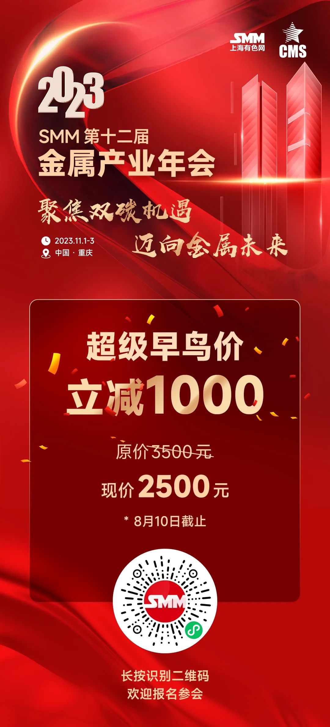 2023 SMM金属产业年会,将于11月1-3日,在重庆召开,会议聚焦金属价格行情、市场趋势、贸易形势、行业政策和低碳技术等热点话题,邀请到行业专家、学者、企业大咖、宏观经济学家和资深分析员等专家做主题演讲。除会议论坛外,还特设企业供需洽谈、长单之夜、 金属嘉年华等环节。现有超级早鸟票(报名立减1000),欢迎大家报名参与2023金属产业年会