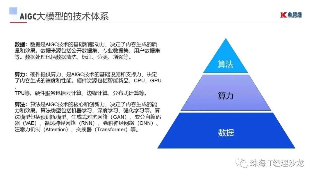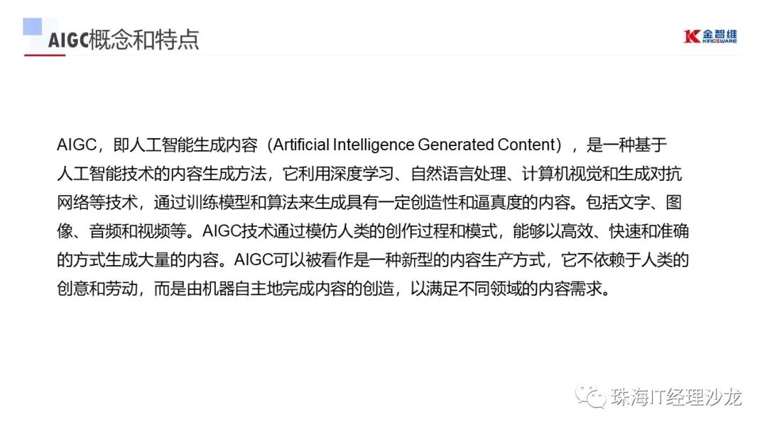 首先,肖总介绍了AIGC大模型,AIGC,即人工智能生成内容(Artificial Intelligence Generated Content),是一种基于人工智能技术的内容生成方法,它利用深度学习、自然语言处理、计算机视觉和生成对抗网络等技术,通过训练模型和算法来生成具有一定创造性和逼真度的内容。
