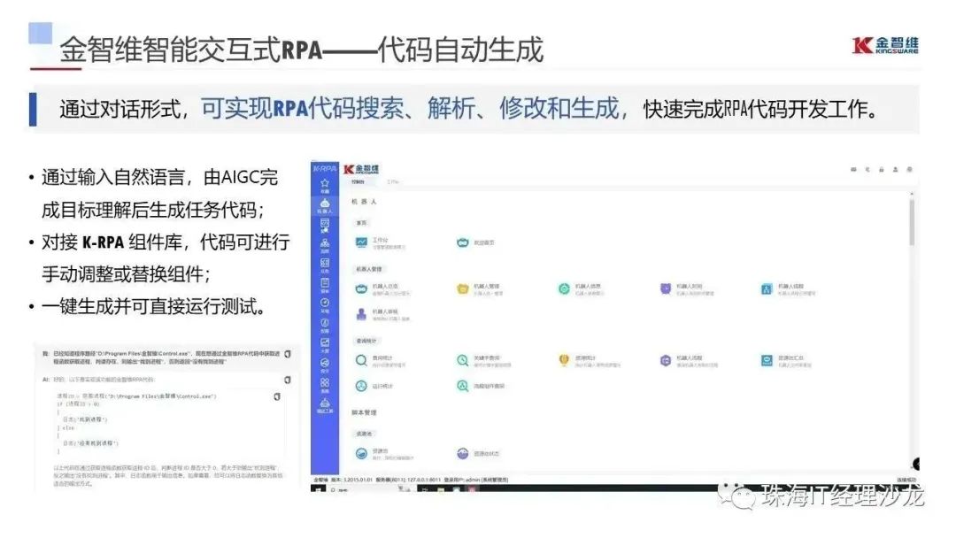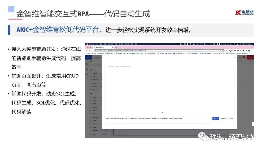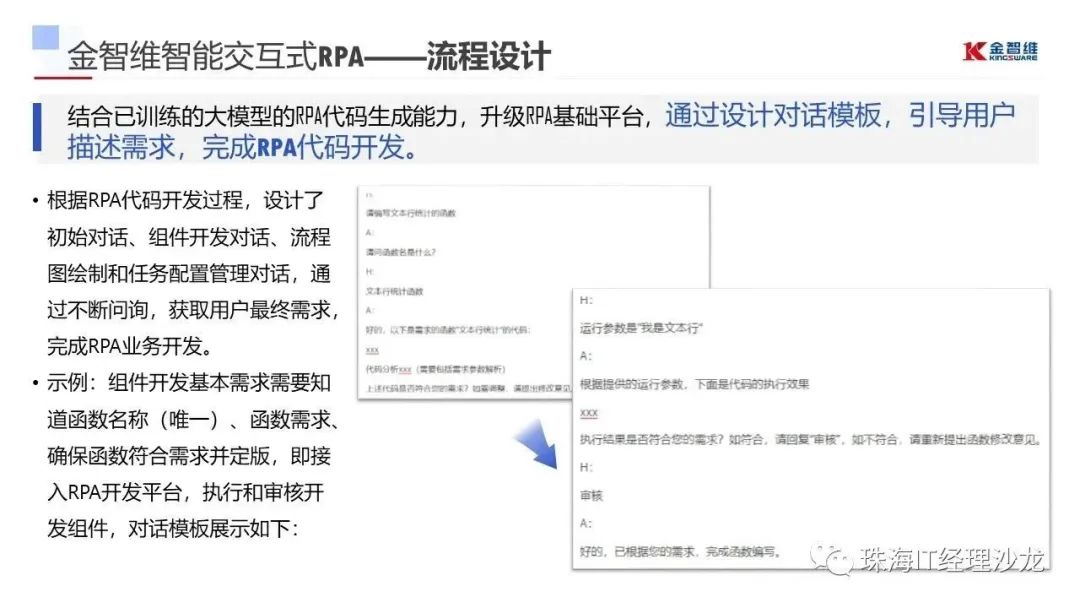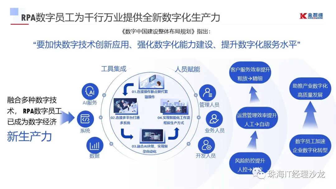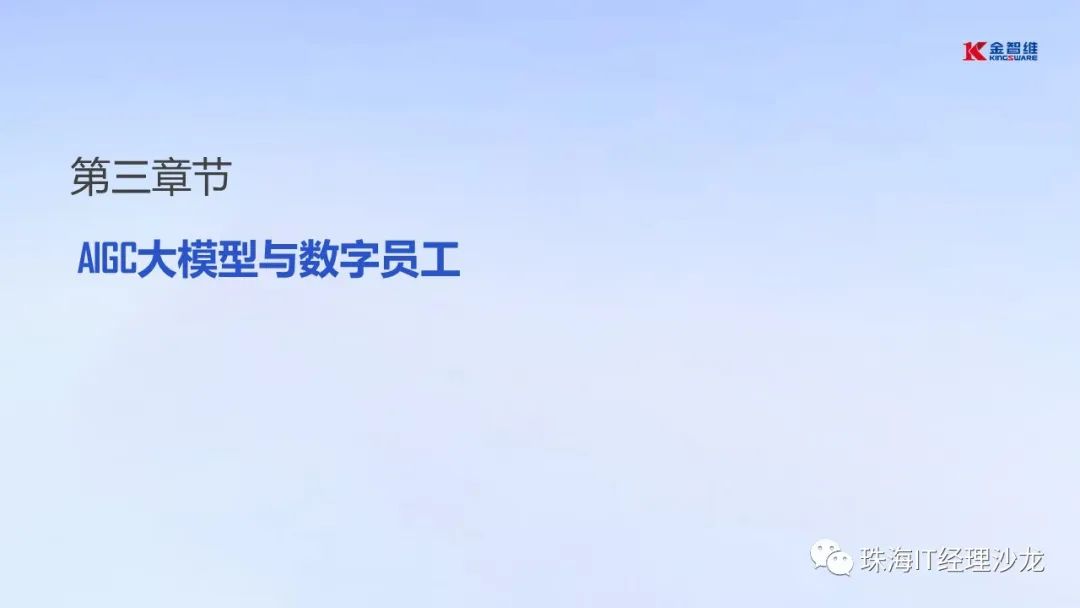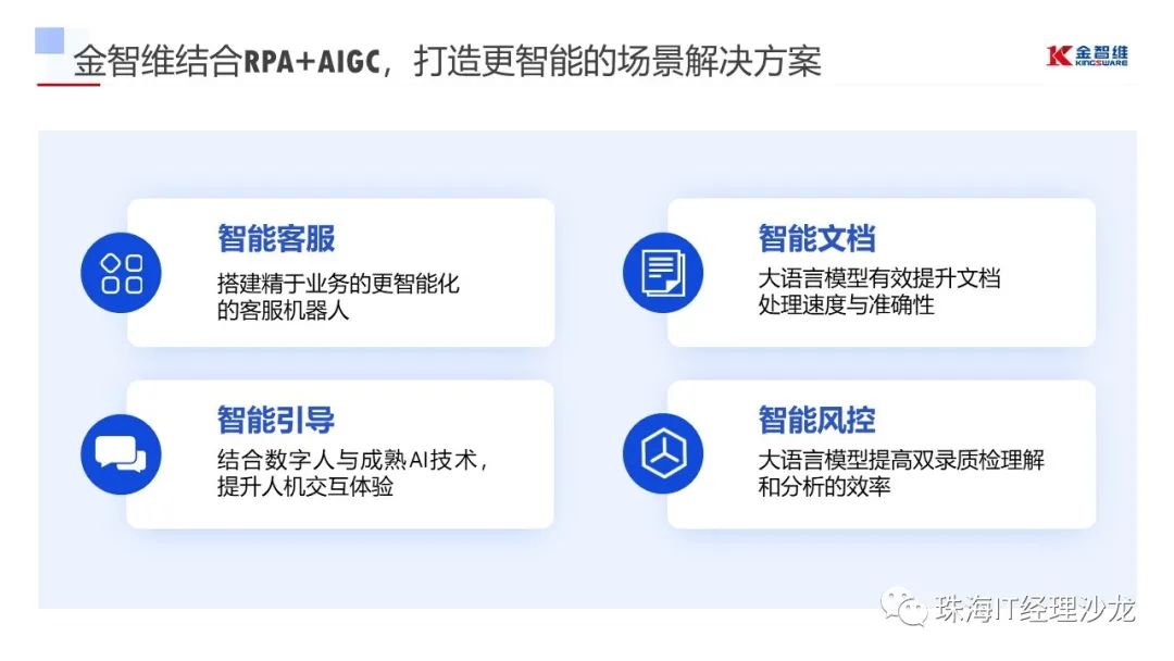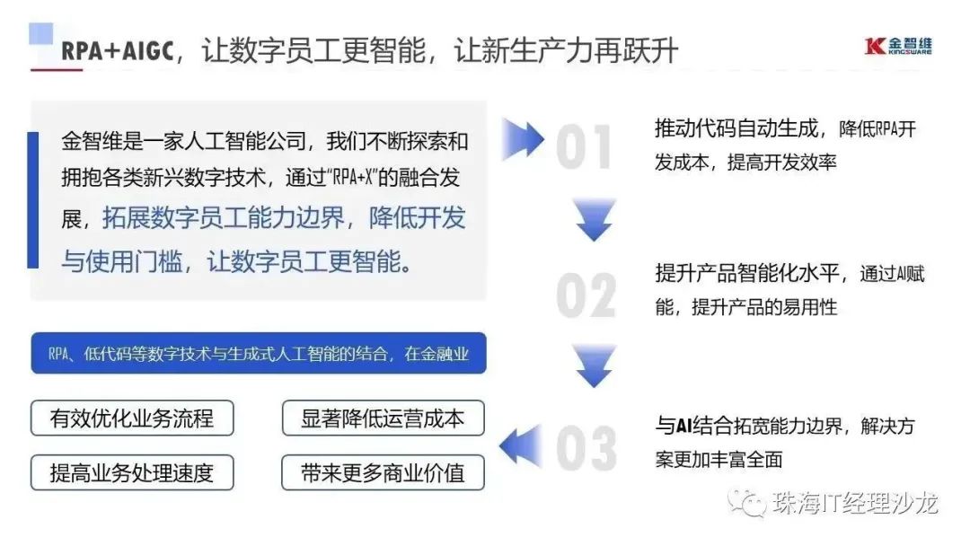 最后,是关于AIGC大模型与数字员工的内容介绍,金智维是一家人工智能公司,坚持不断探索和拥抱各类新兴数字技术,通过“RPA+X”的融合发展,拓展数字员工能力边界,降低开发与使用门槛,让数字员工更智能。