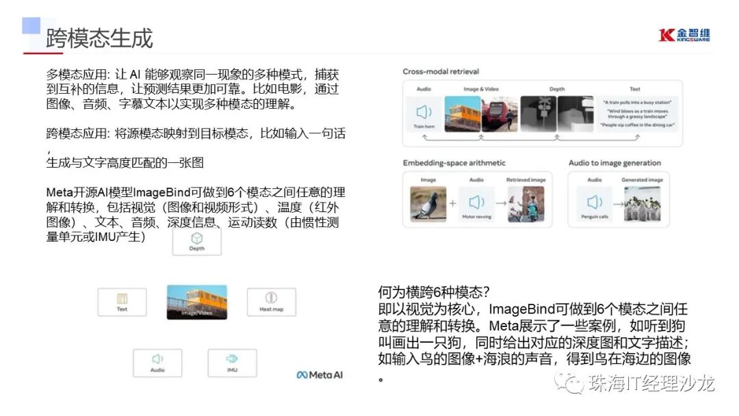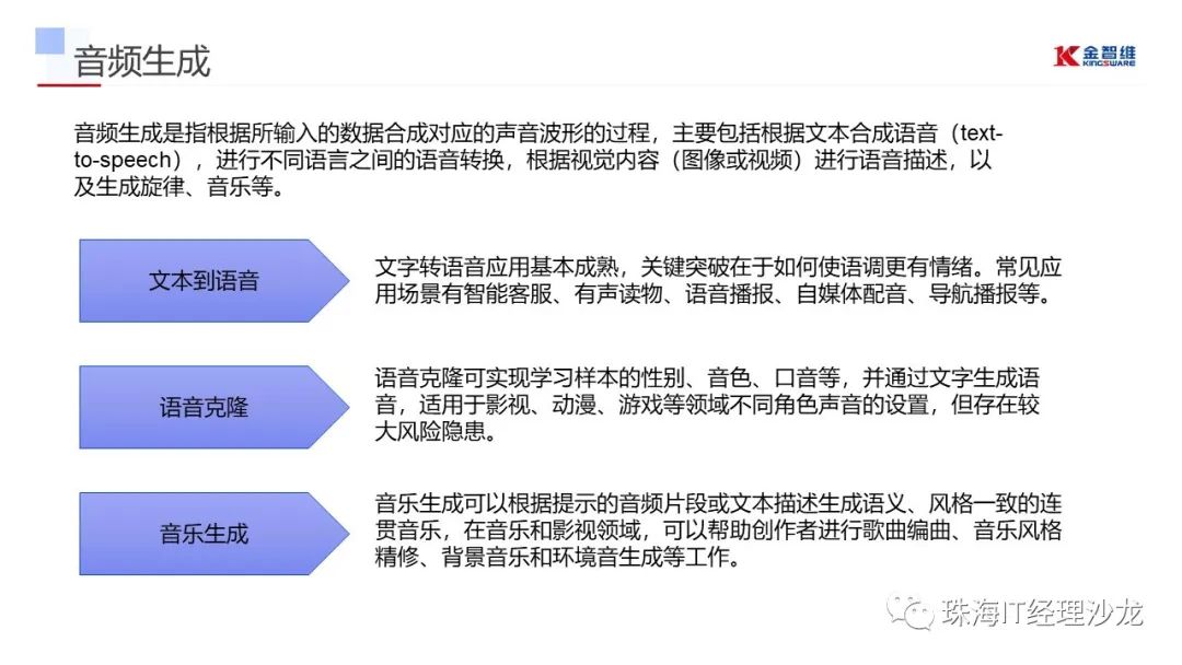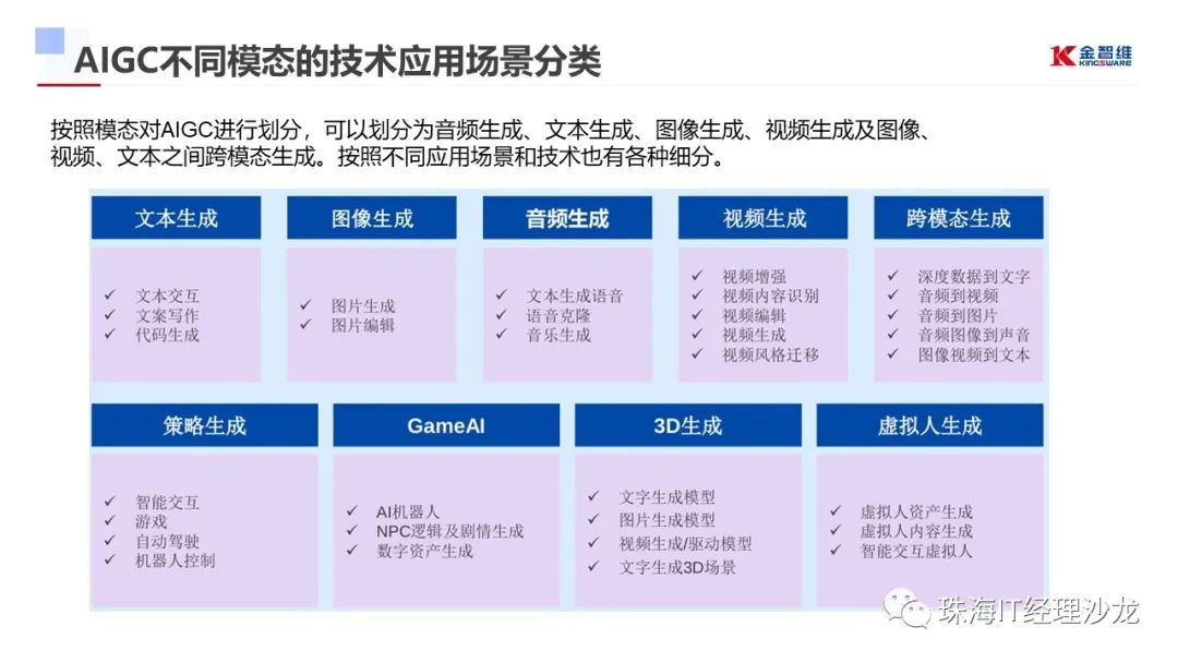 紧接着,肖总介绍了AIGC大模型的研究方向,AIGC不同模态的技术应用场景分类包括了:音频生成、文本生成、图像生成、视频生成及图像、视频、文本之间跨模态生成。按照不同应用场景和技术也有各种细分。