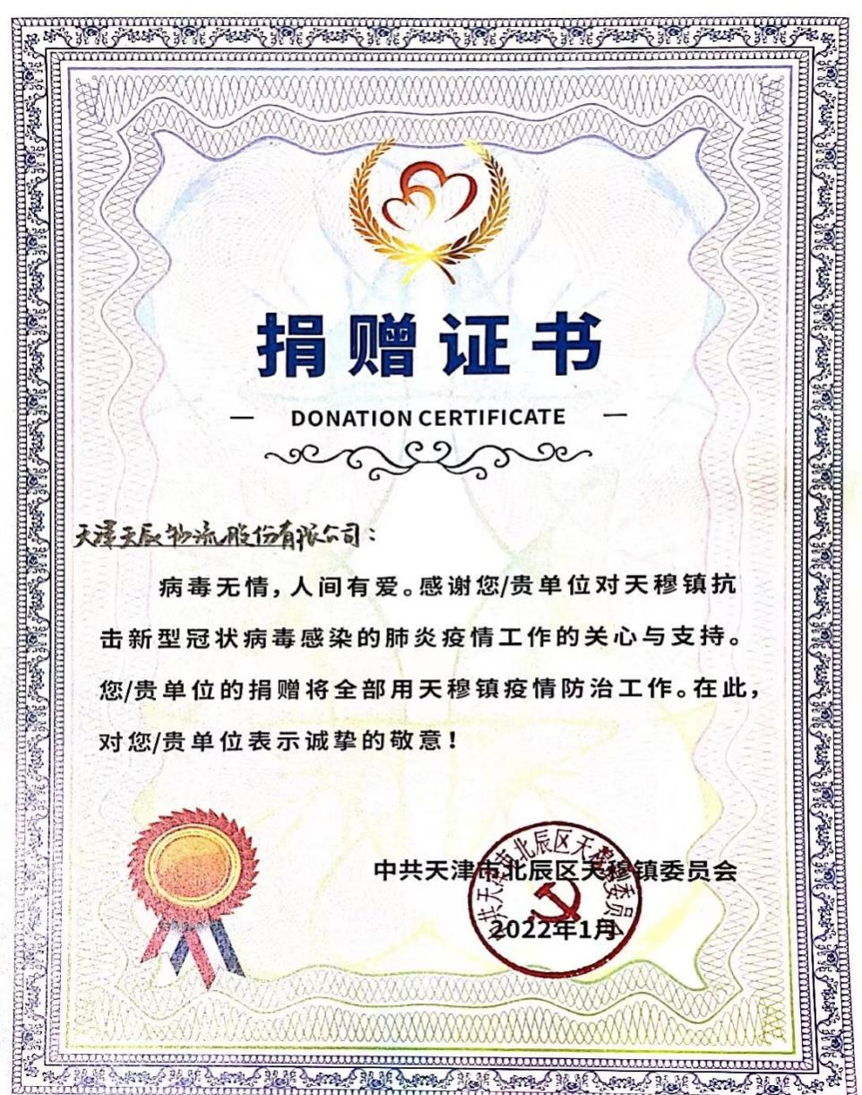2020年初新冠疫情开始,为满足客户生产口罩原料及无纺布配送需求,组织企业员工加班加点连续奋战在一线,为抗击疫情救助物资的运输争取了宝贵时间。在2020年一季度内企业就累计帮助政府及各部门完成23次防疫物资运输任务,获天津市北辰区疫情防控工作指挥部授予荣誉证书;2022年9月在疫情期间为响应北辰区政府对口帮扶甘肃省华池县的号召,企业捐款10000元;2022年2月向天津市北辰区天穆镇捐赠价值10350元的抗疫物品;2022年5月为市、区合作交流办承担天津市支援西藏自治区昌都市防疫物资运输任务,顺利保障物资及时到达昌都市;2022年10月为天津市北辰区天穆小学传统花键项目捐款3000元。