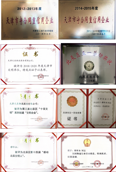 企业经过多年脚踏实地的奋斗,长期坚持诚信守法服务社会的经营准则,获得政府和社会的一致好评,被天津市市场监督管理委员会连续两届评为天津市“守合同重信用”企业,被北辰区交通安全委员会评为“交通安全先进单位”,被天津市民族和宗教事务委员会评为“天津市民族团结进步创建示范单位”,被北辰区精神文明建设委员会评为第三届北辰区“十项文明”系列创建“文明企业”,被天津市评为“天津市文明企业”,被北辰区总工会评为“北辰区五一劳动先进单位”。企业负责人穆怀永先生获得“全国物流行业劳动模范”称号,被北辰区精神文明建设委员会评为第十四届“感动北辰文明人”,被天津市总工会授予“天津市五一劳动奖章”,并在2018年6月11日受邀走进人民网,参与了《奋斗者说》栏目,讲述了天辰物流在物流行业的创业经历。